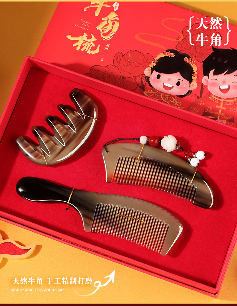 メーカー直販天然牛角櫛男女通用マッサージ旧正月礼箱セット天然牛角櫛