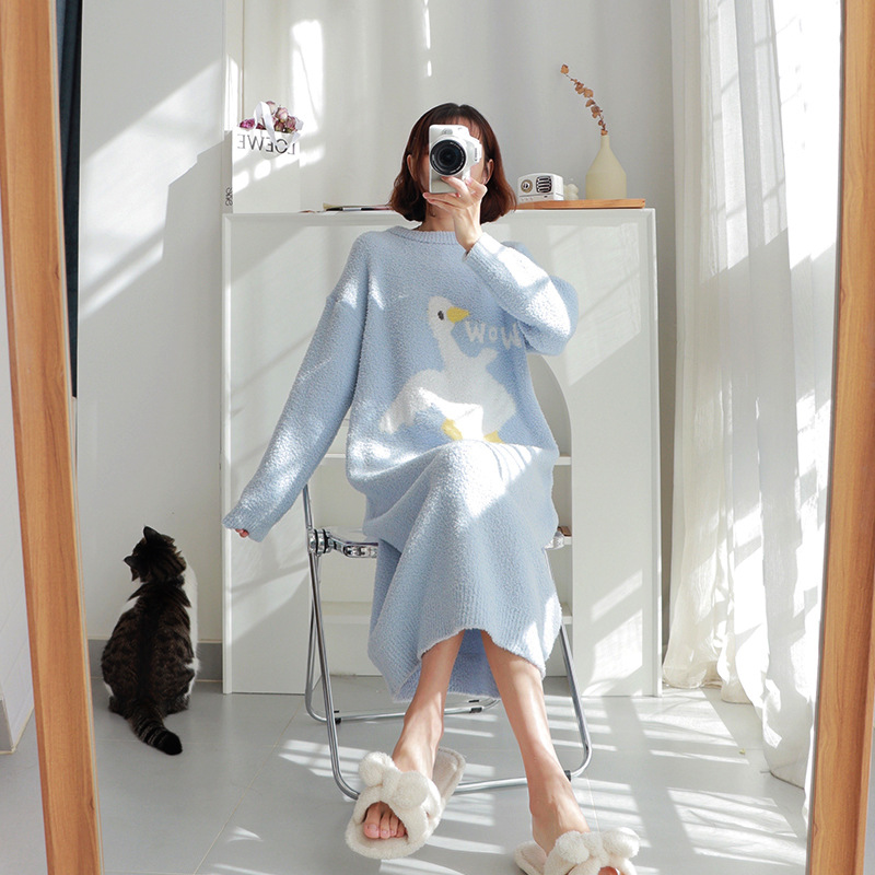 日本系アニメの大白ガチョウのふわふわした寝スカートの女性秋の冬の長い膝の厚いサンゴの毛の長袖のパジャマ