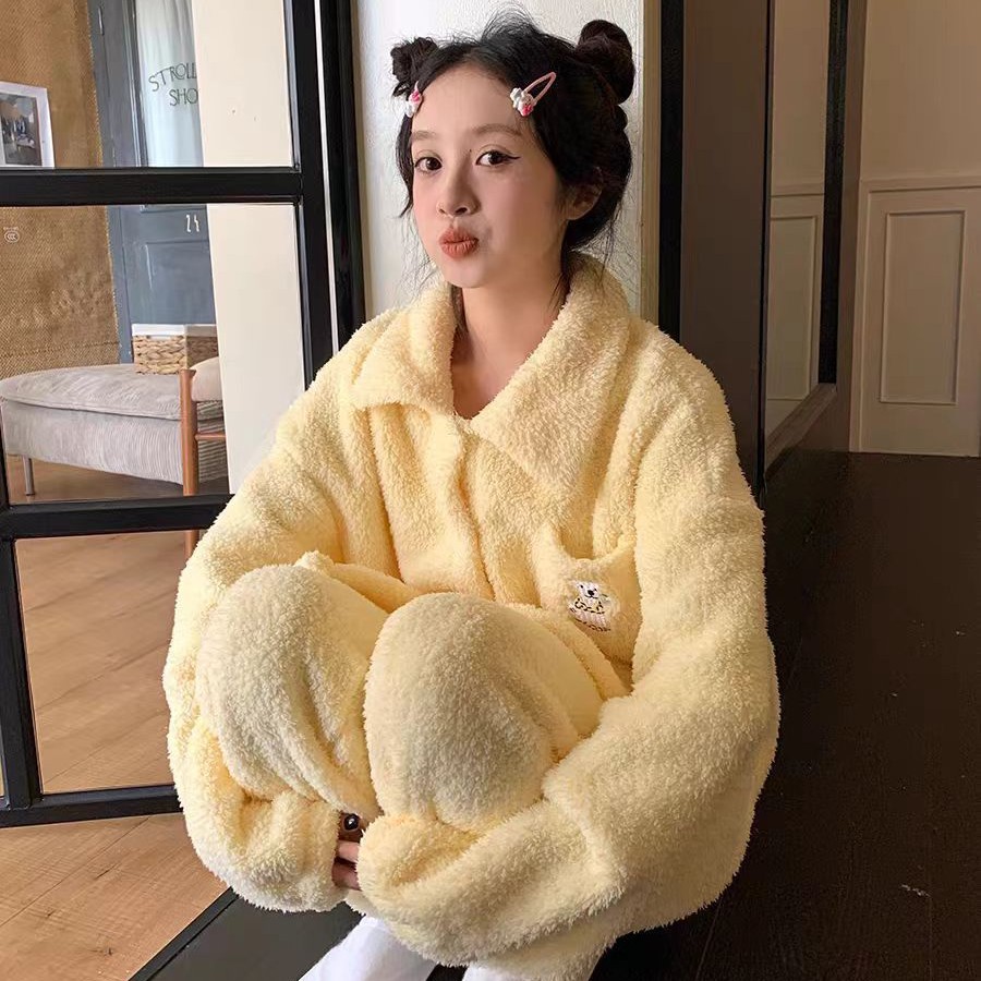 冬のベルベットのパジャマはシンプルで甘いカジュアルなカーディガンの家庭服の女性サンゴのベルベットの冬の長袖セットは着ることができる