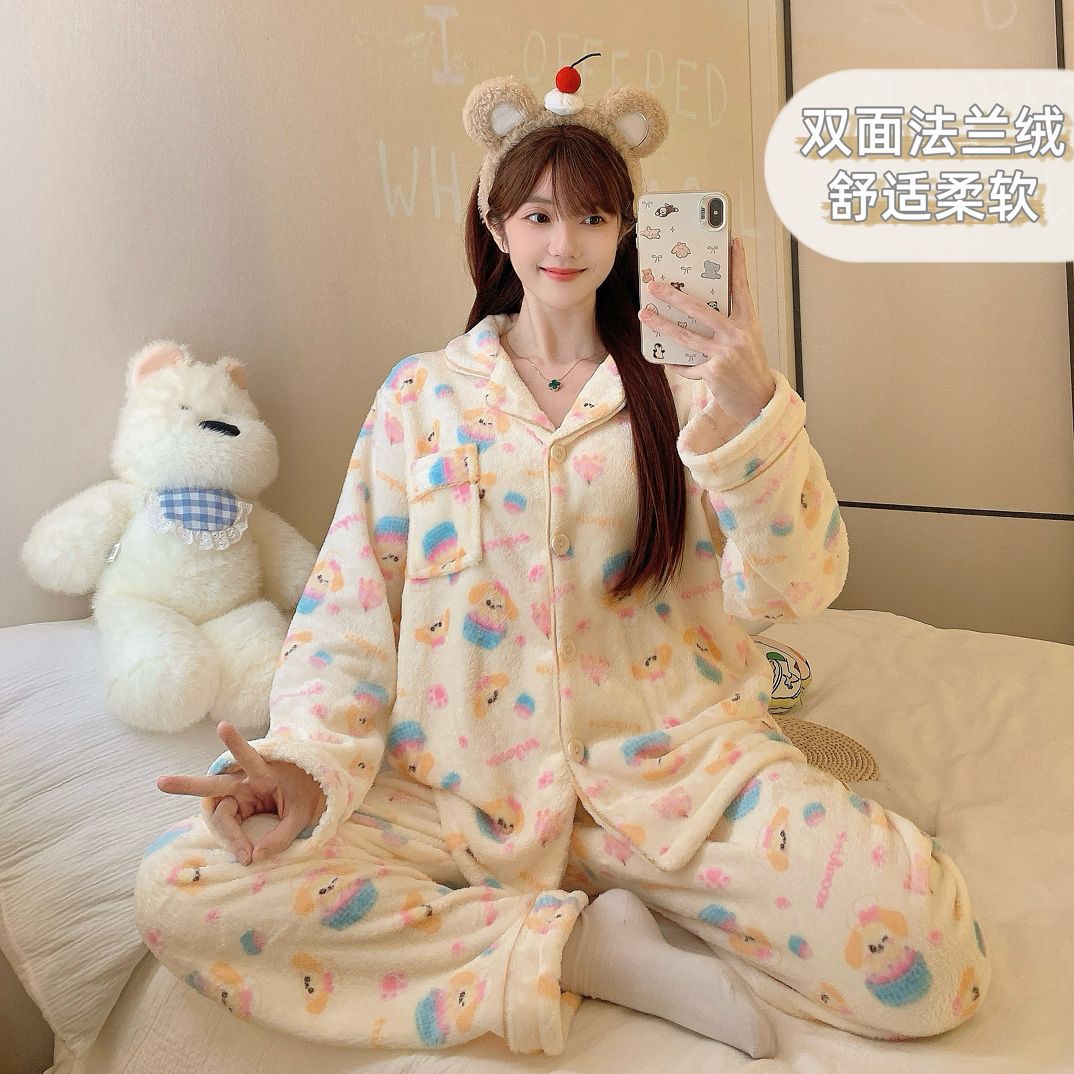 秋冬季法兰绒睡衣女卡通可爱加绒加厚保暖长袖家居服两件套可外穿