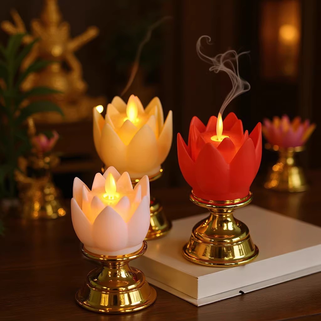 新商品の金色の台座の蓮の花の明かりのled電子のろうそくの明かりの仏陀は明かりを供えて長い明かりの寺院の電子の燭台を揺り動かします。