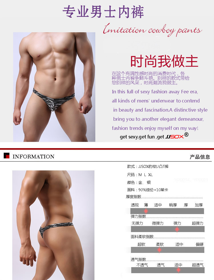 【名称】:JJSOX豹纹U凸T裤 尺码建议:M (2尺-2尺3腰围)L(2尺3-2尺6腰围) XL (2尺6-2尺9腰围) 个人的实际情况不同,建议只是作为参考,一般是您平时买什么码数的现在就买什么码数! 【说明】:内衣为贴身物品,如无质量问题恕不退换,敬请理解! 面料厚度: 220g/m2,适合打底穿着。 剪裁与修身效果: 内裤有很好的贴身感, 穿久也不会松垮变型,特别设计加宽的裤脚贴护大腿根部,舒适并显大气,合适的松紧程度不会有松垮和紧勒感。 |