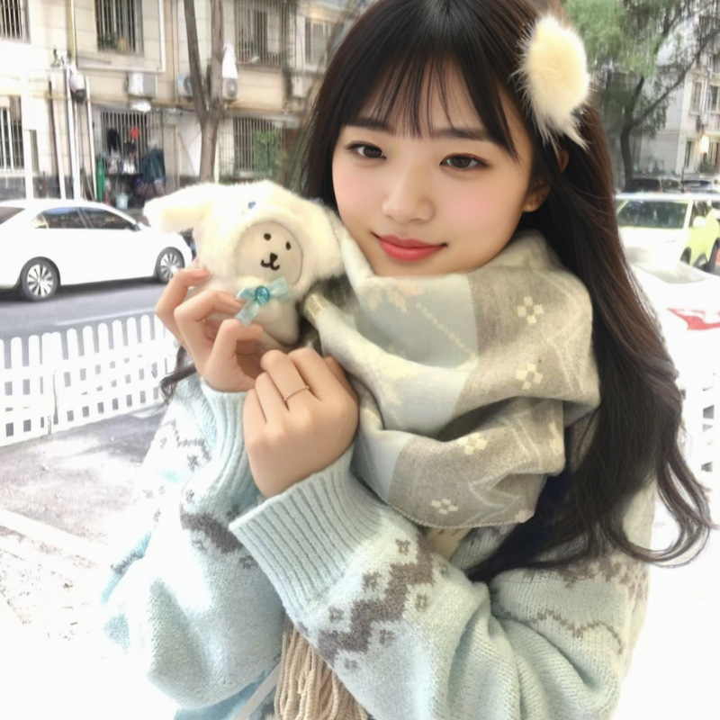 日系秋冬季新款小清新冬日雪兔保暖围巾女加厚加大披肩两用