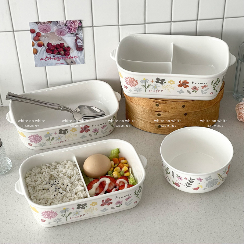 奶黄正方形保鲜盒分格收纳盒饭盒冰箱微波炉加热便当带饭陶瓷餐具