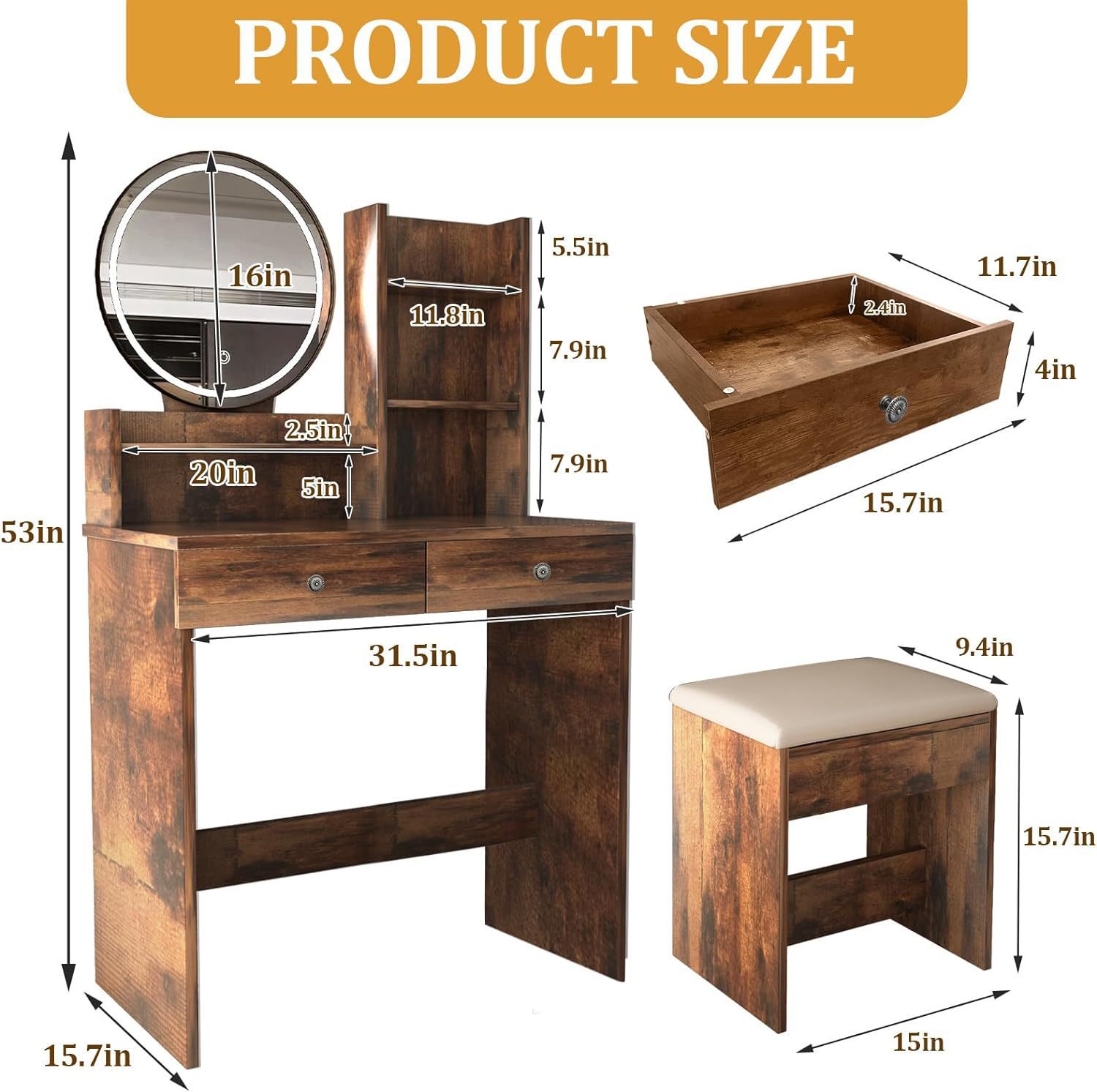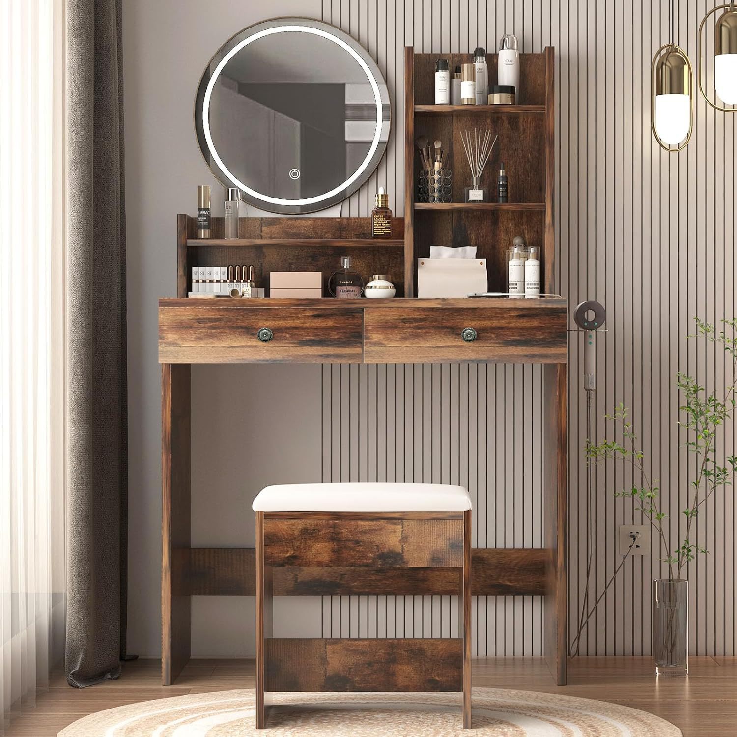 Led照明ミラーと充電スタンドの化粧台田舎風の小さな化粧台2つの引き出し付き化粧台