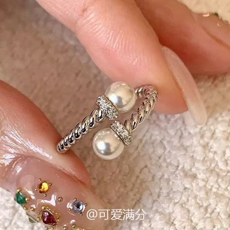 高級感気質麻花真珠開口指輪秋冬軽贅沢ファッション全ドリルワイドリング