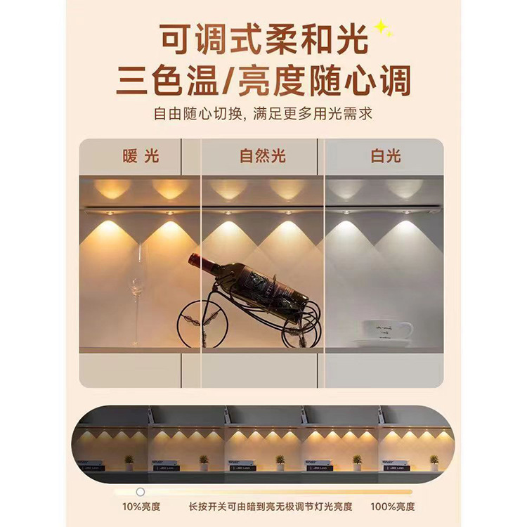 環境に優しいボタン式二色スマートUSB充電式磁気LEDワードローブライト、キャビネット用ナイトライト、人体センサー付き小型ナイトライト