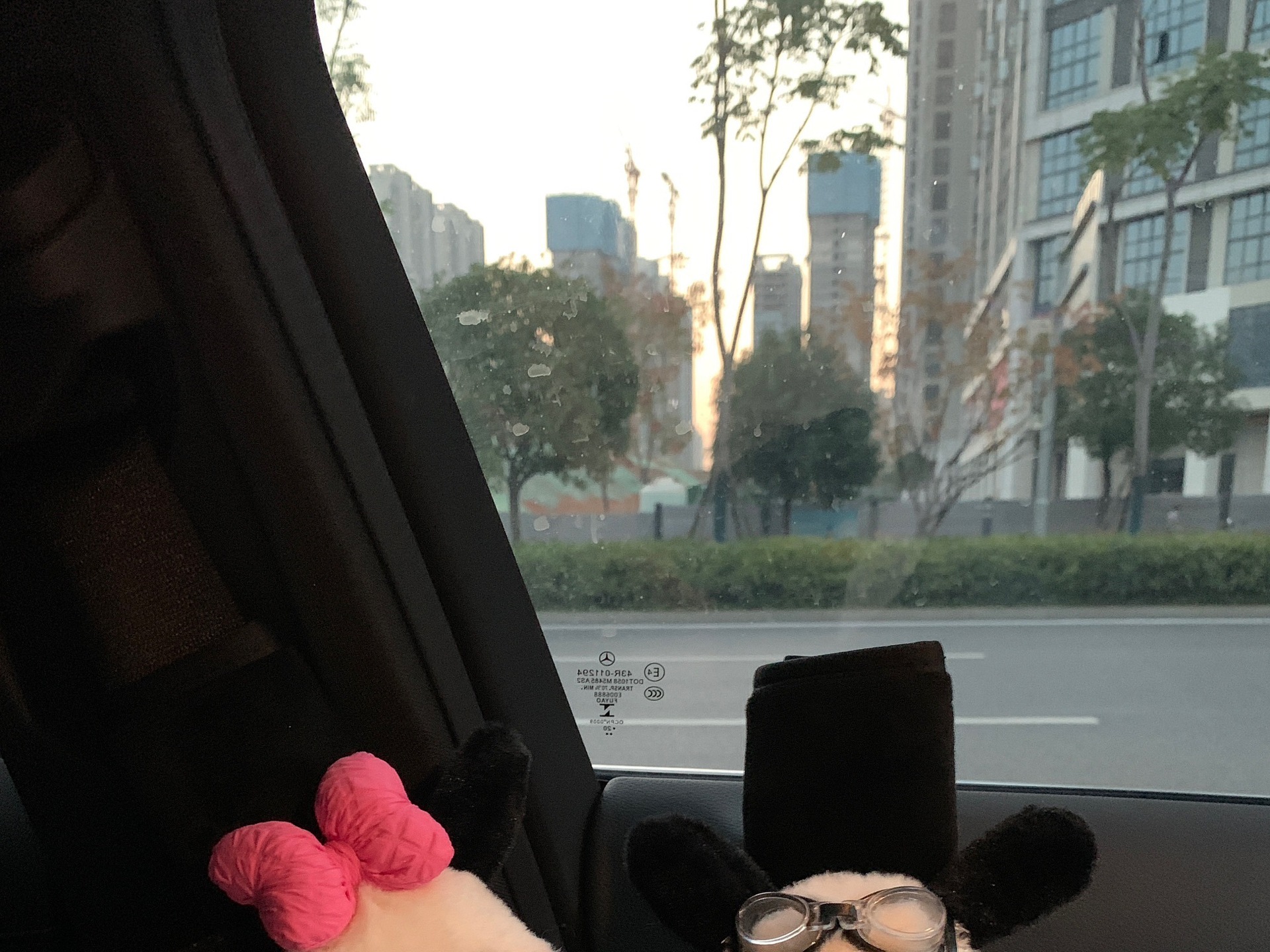 スプリングが首を横に振って風船を告白します。車内の車の置物が可愛いです。