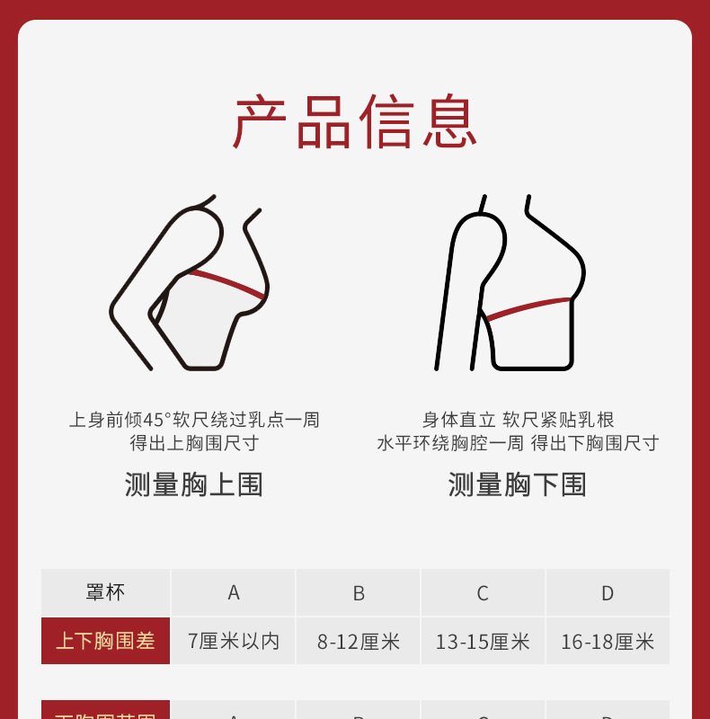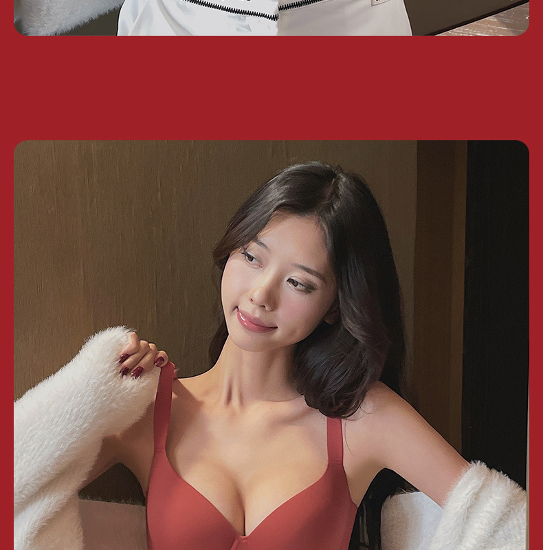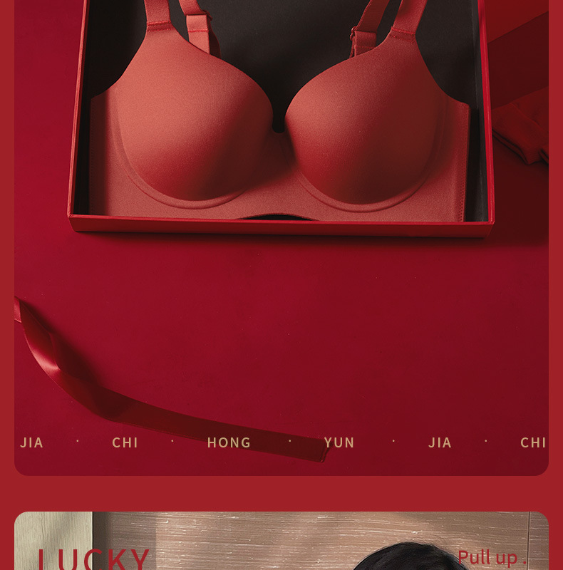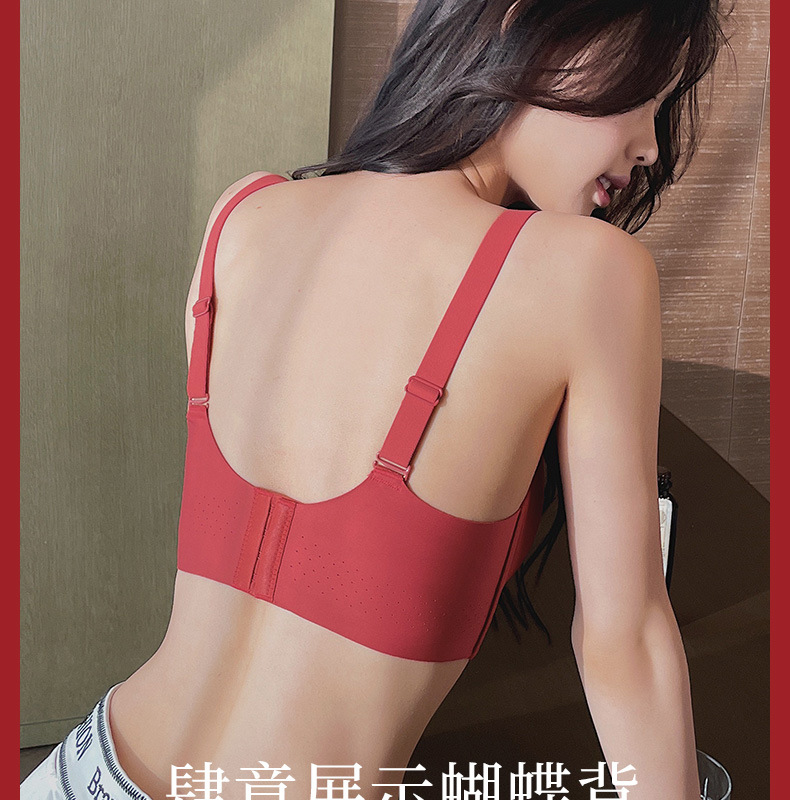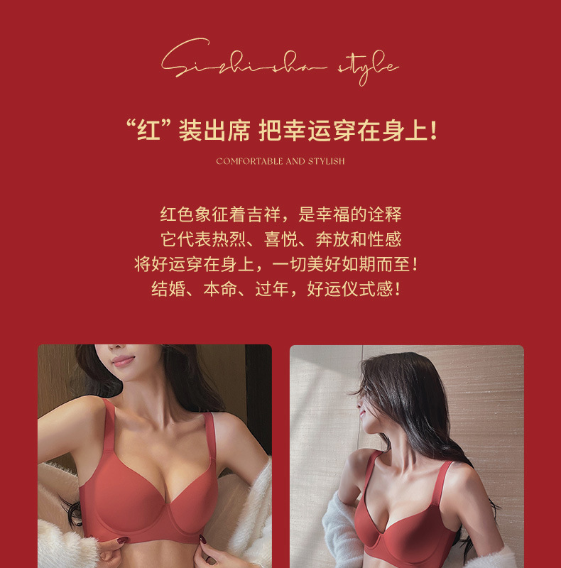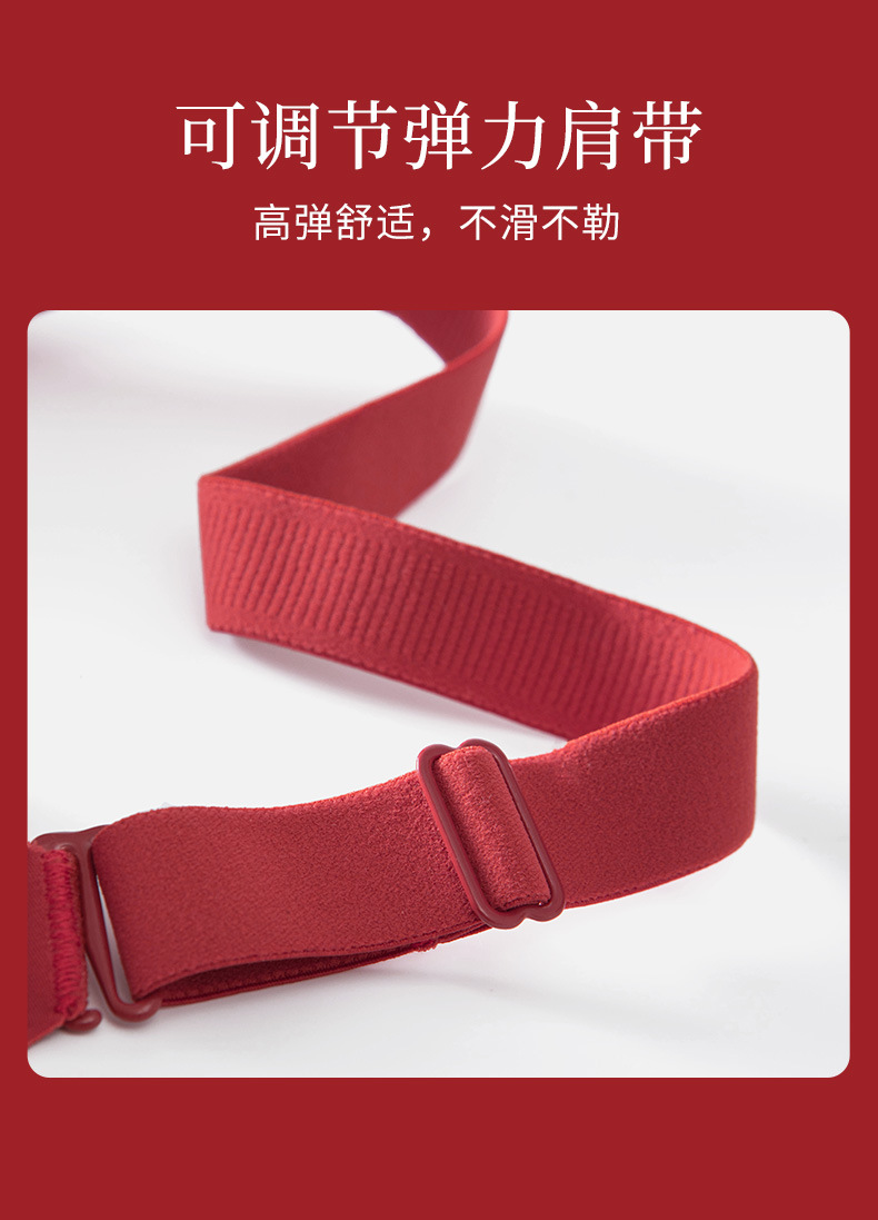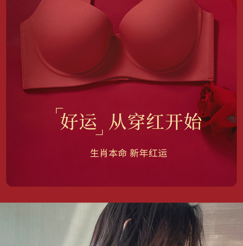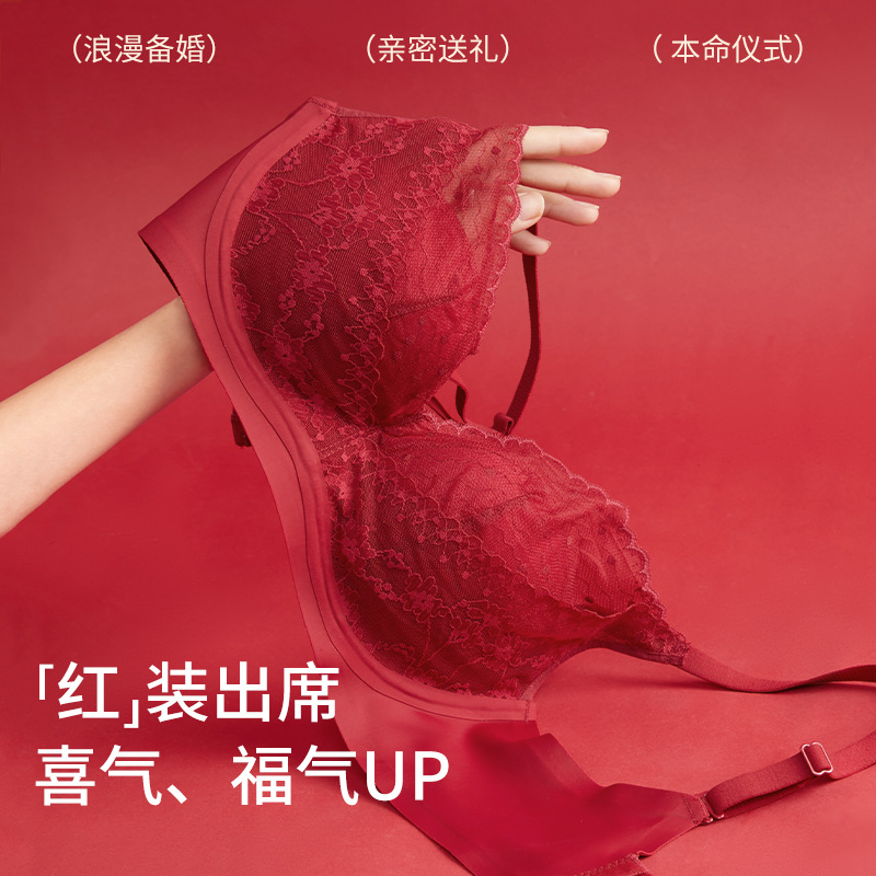 本命年の赤い下着のスーツの女性の胸は集まって無鋼の輪のブラジャーを支えて副乳の調整型のブラジャーを収めます。