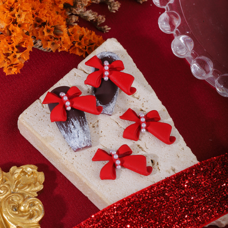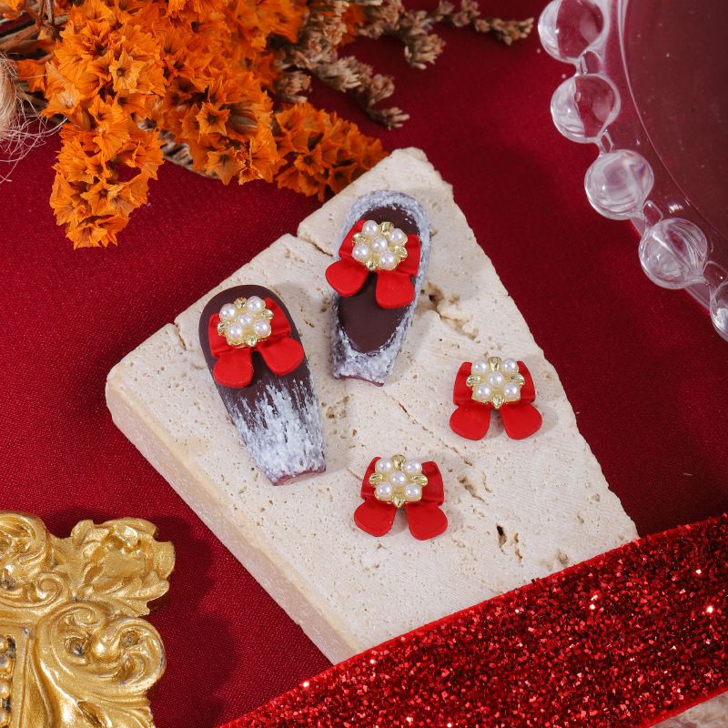 2024年新年ネイルアート蝶結び合金アクセサリー大紅シリーズネット赤新モデルに真珠爪ドリルアクセサリーを入れる