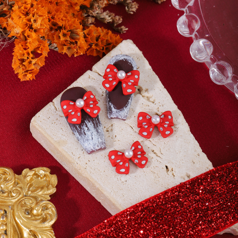 新年のネイルの大きい赤い波の点の蝶結びのネイルアクセサリーのネットの赤いリボンの蝶結びの真珠の服装の甲の飾り