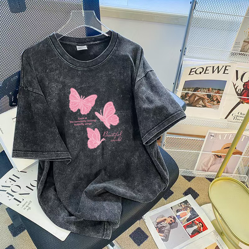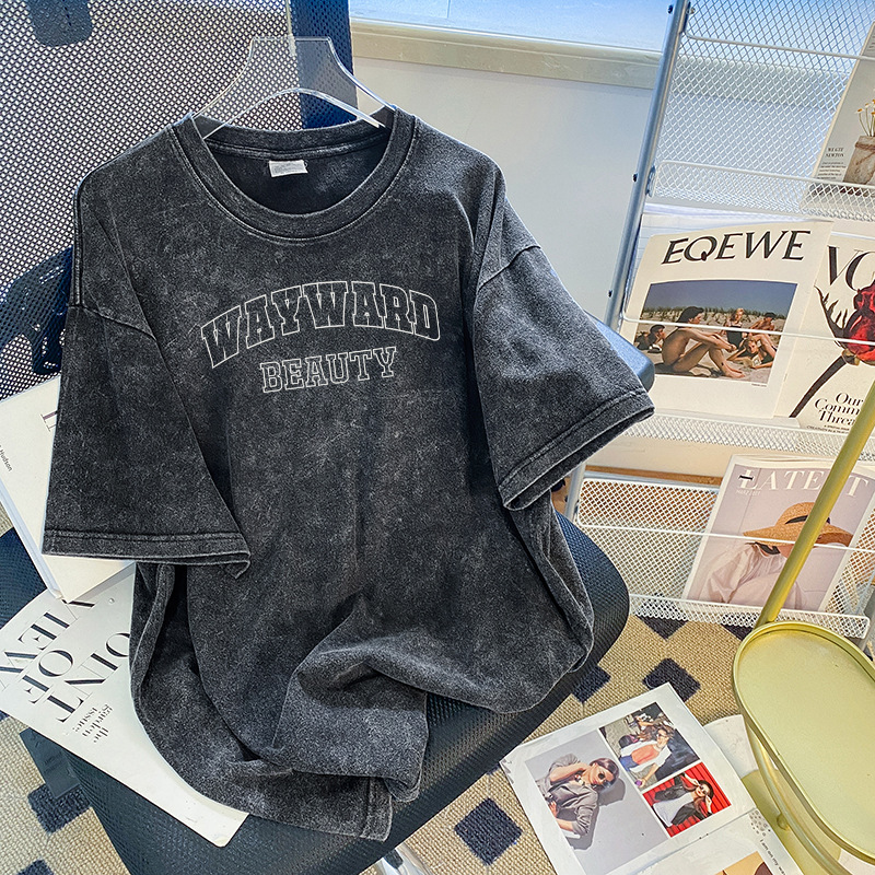 ヨーロッパとアメリカのヒップホップトレンディなブランドダメージ加工半袖Tシャツレディース大きいサイズルーズオーバーサイズウォッシュブラックプリントトップス