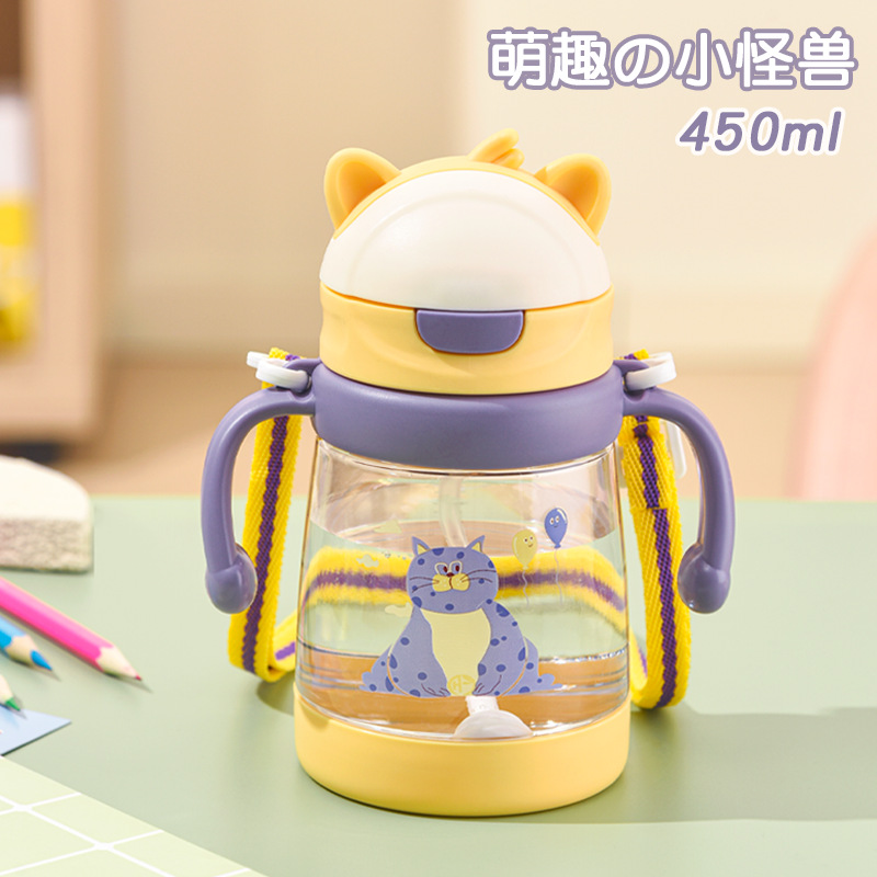 2024新品子供ストローカップかわいいアニメスタイル直飲ストラップ付きプラスチックハンドル付き学飲カップ