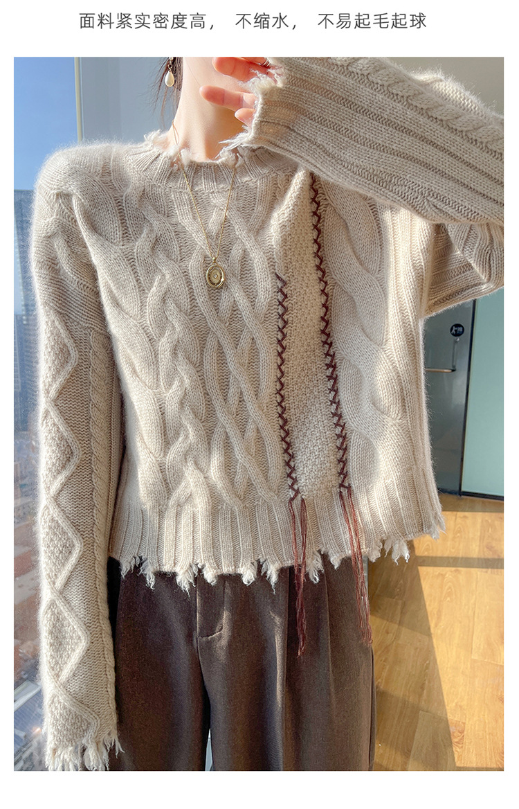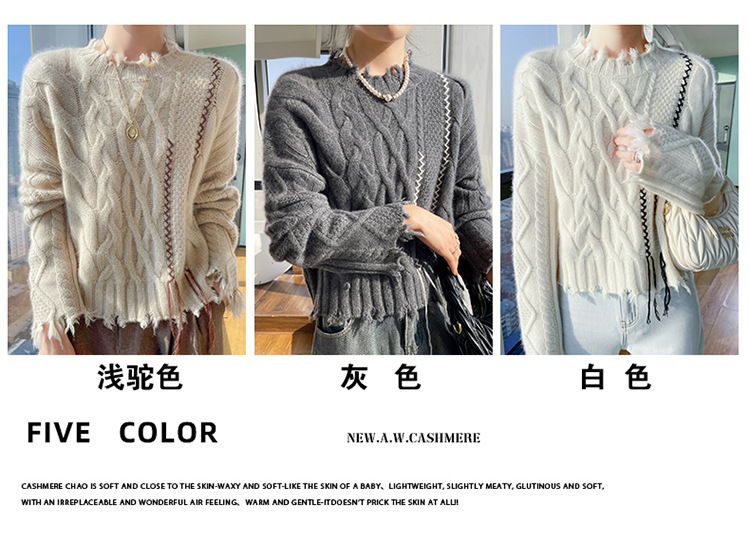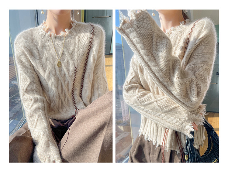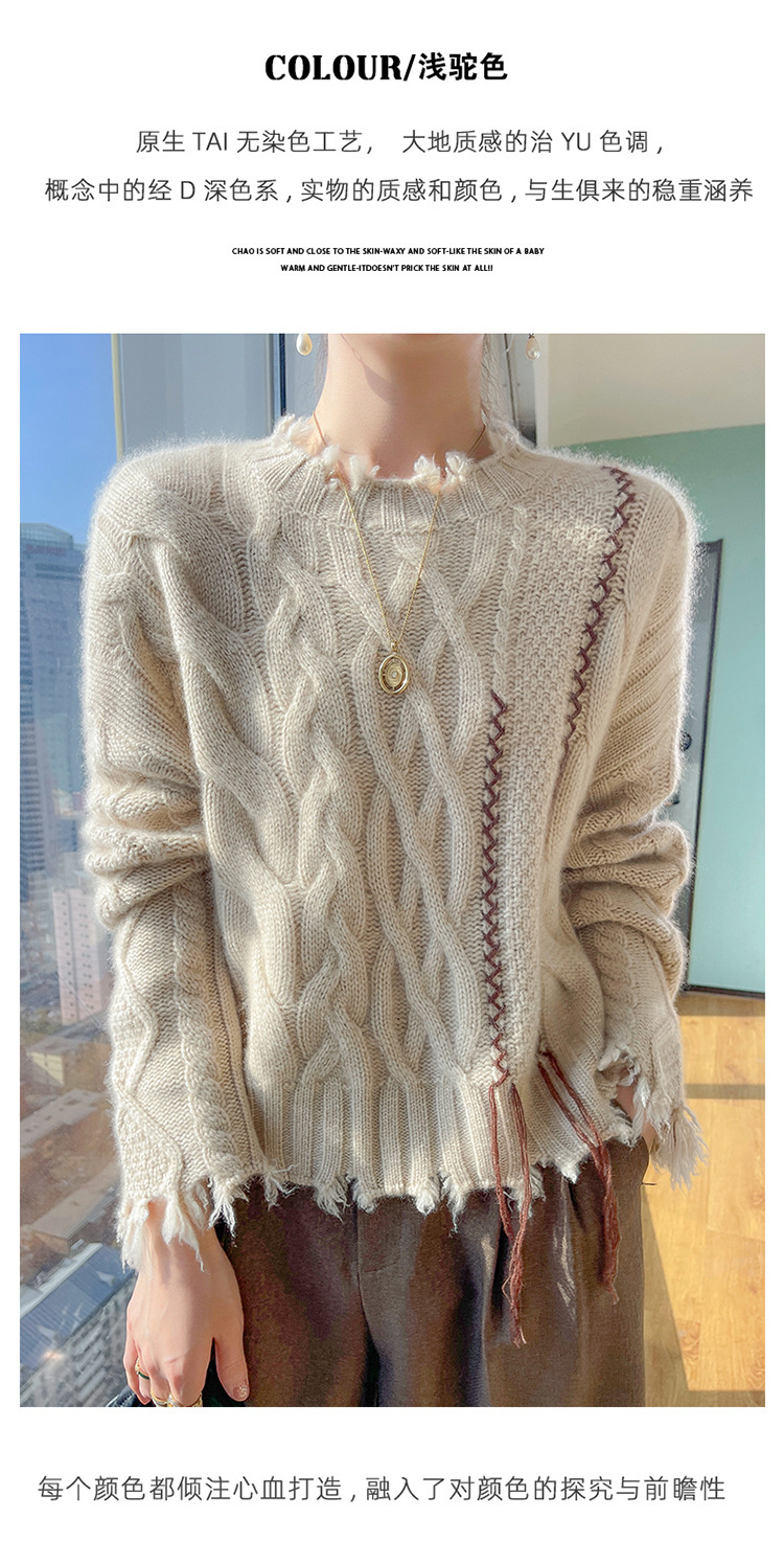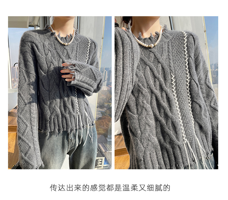 ゆったりとした怠惰な風の丸首2023ウールのセーターの女性のフリンジの花の長袖のセーターの厚い色合わせのウールの上着