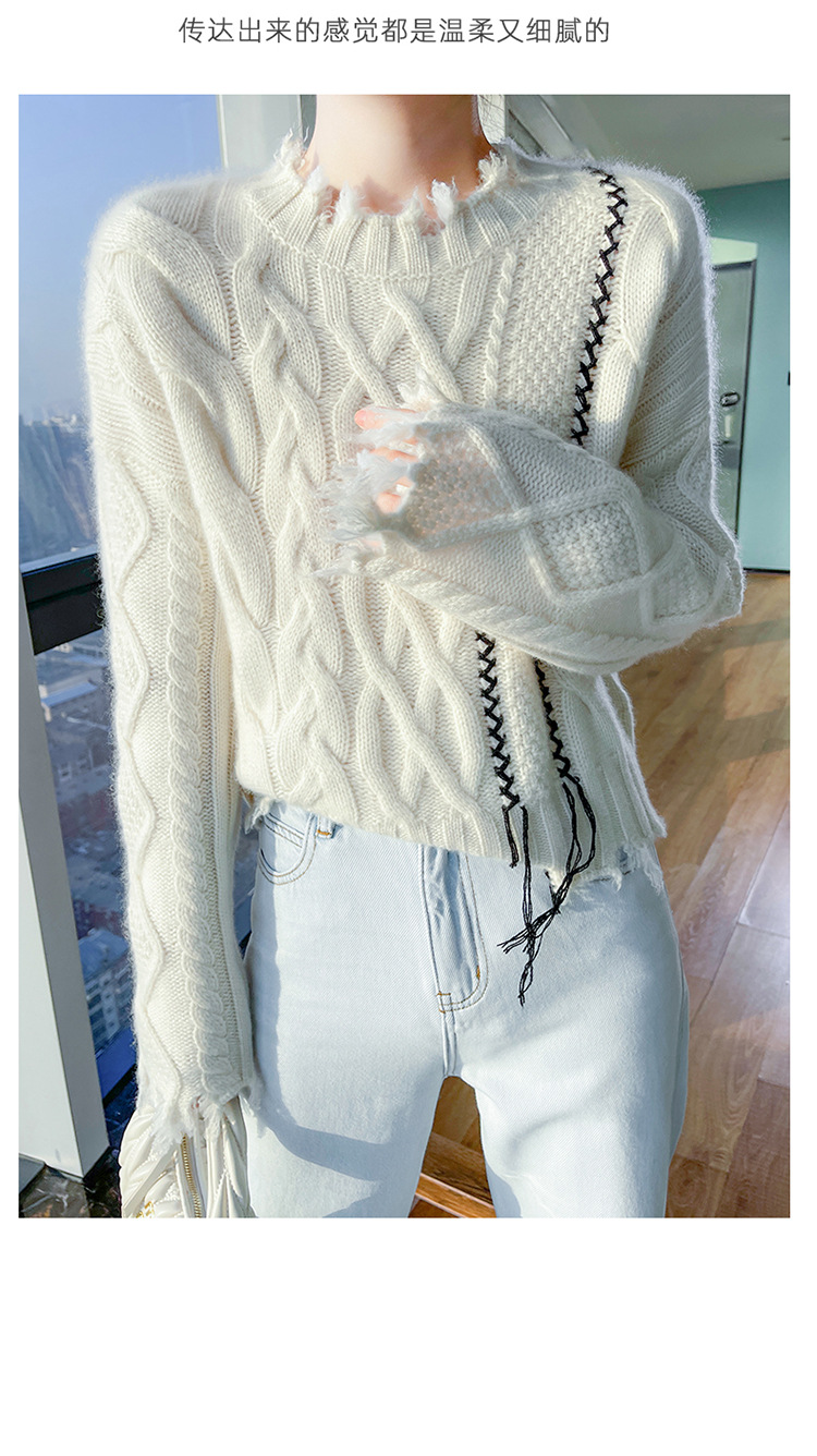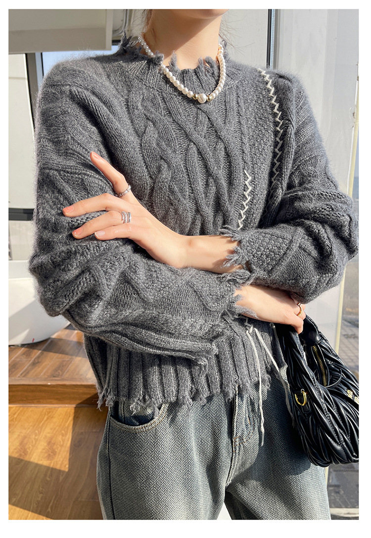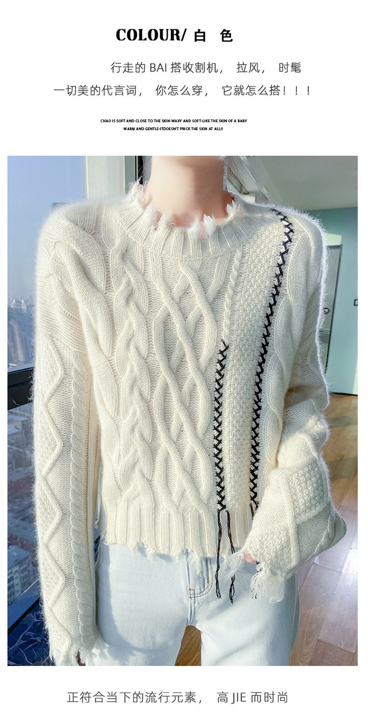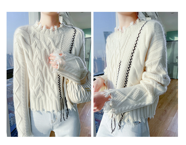 ゆったりとした怠惰な風の丸首2023ウールのセーターの女性のフリンジの花の長袖のセーターの厚い色合わせのウールの上着