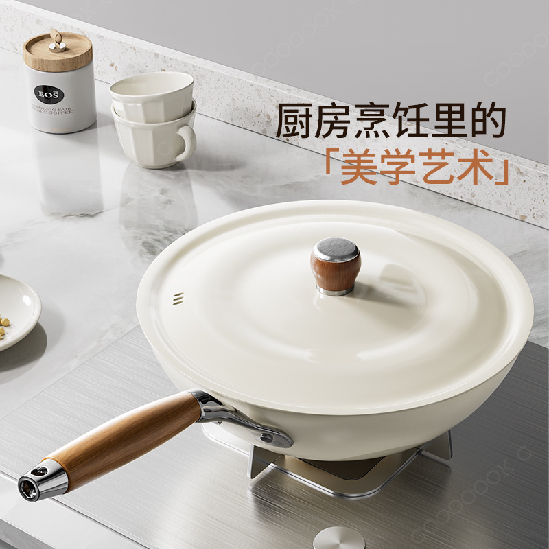 新しいクリーム色のエナメル炒め鍋家庭用陶磁器釉薬炒め鍋はチタンを含んでいます。
