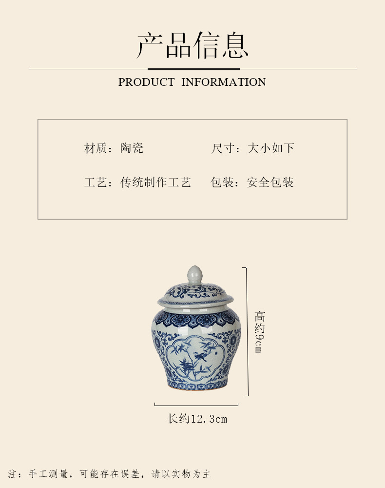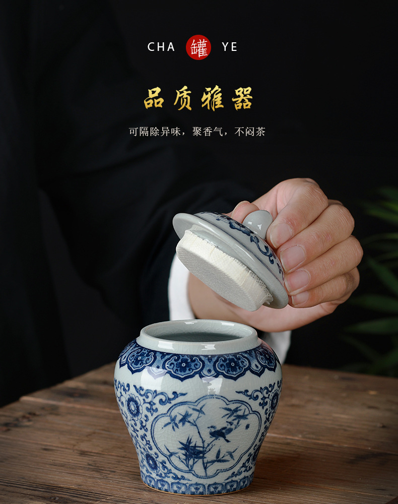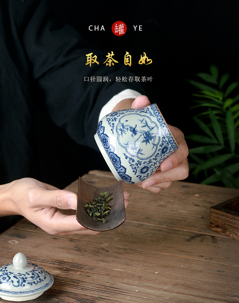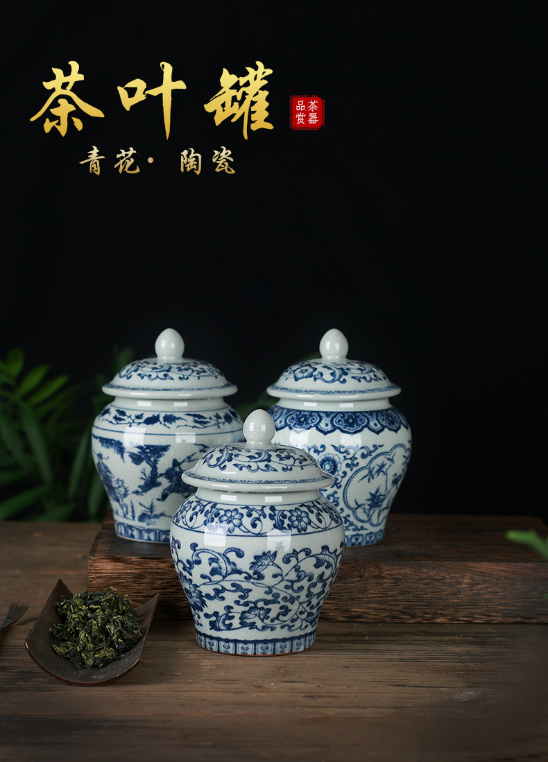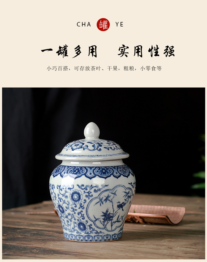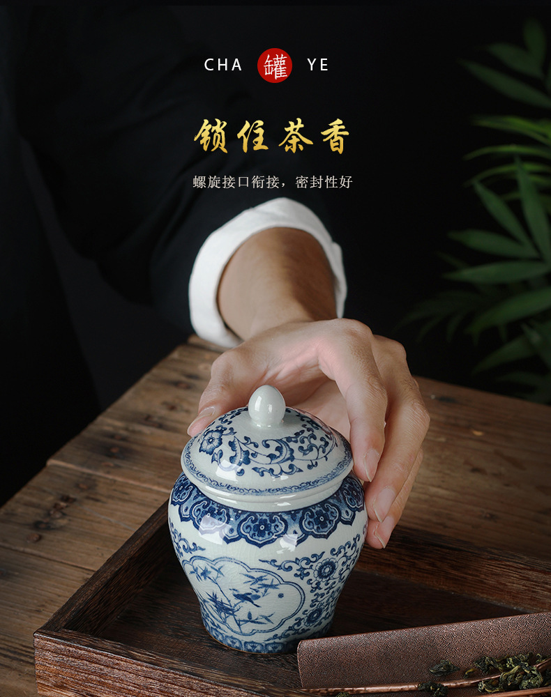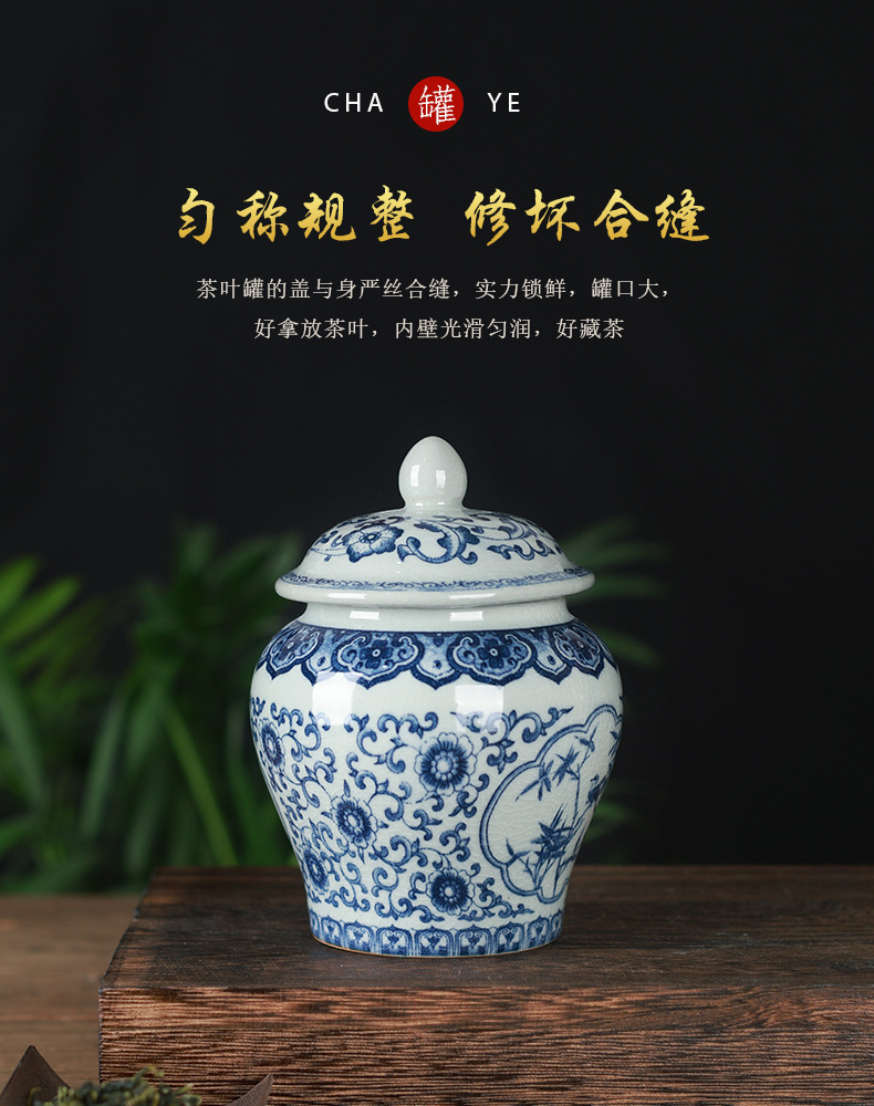 レトロ青花釉薬茶葉缶将軍缶陶磁器部品茶葉収納缶防湿家庭用密封茶葉缶