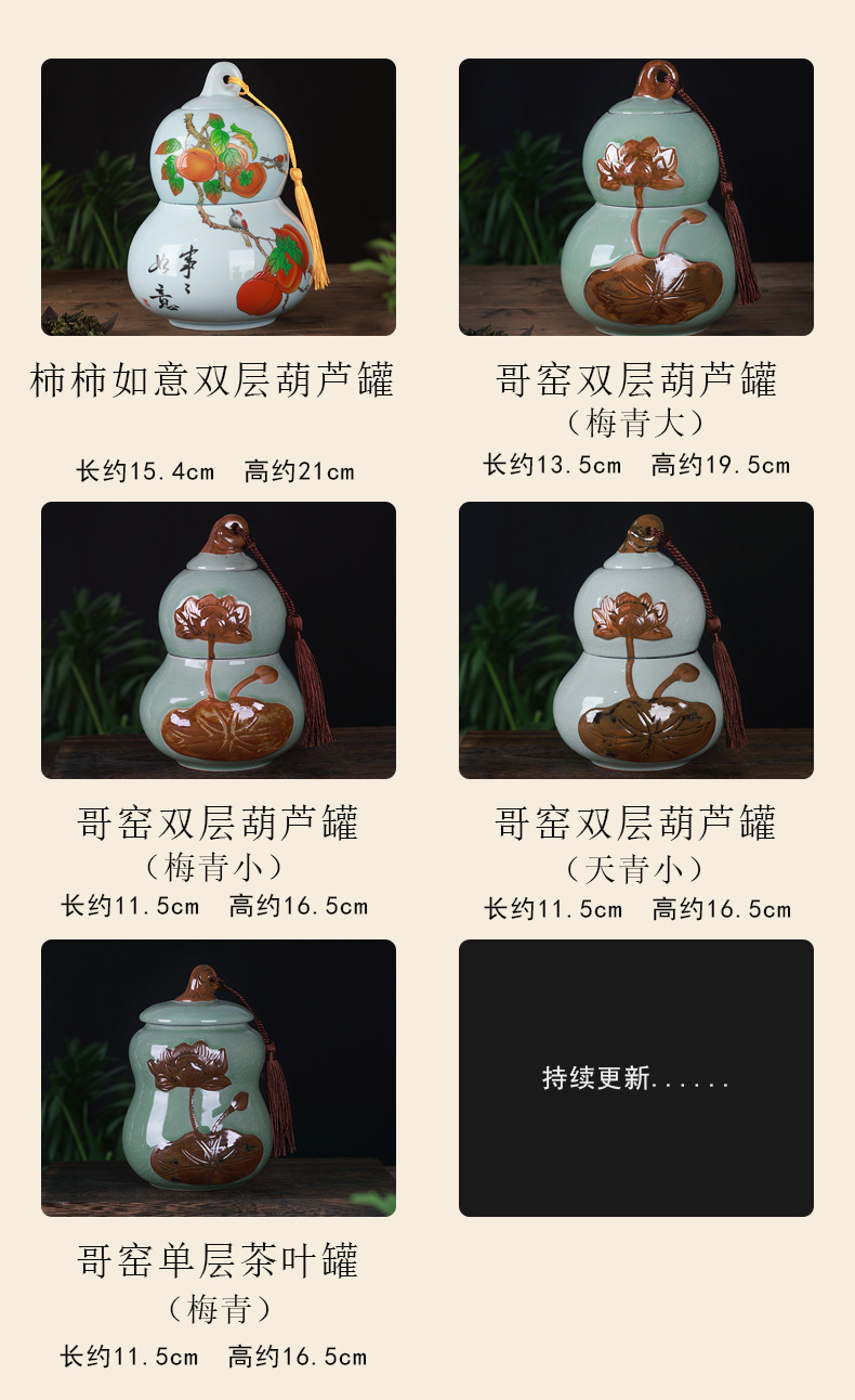 カラー 鬼谷下山茶葉缶,窓開け竹韻茶葉缶,連理枝茶葉缶,哥窯茶葉缶 (梅青),哥窯茶葉缶 (天青),哥窯茶葉缶 (スカイブルー),哥窯単層ヒョウタン缶 (梅青),兄窯二重ひょうたん缶 (梅青小),兄窯二重ひょうたん缶 (天青小),兄窯二重ひょうたん缶 (梅青大),柿如意二重瓢箪缶