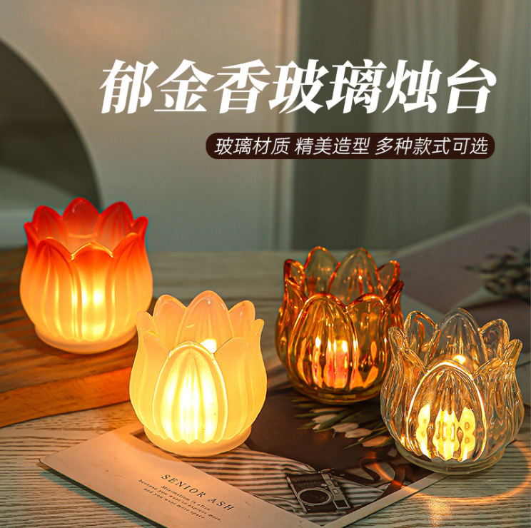メーカーはチューリップのガラスの燭台の香薫のガラスのろうそくの杯のフランス式のロマンチックな復古の食卓のろうそくの置物を供給します。