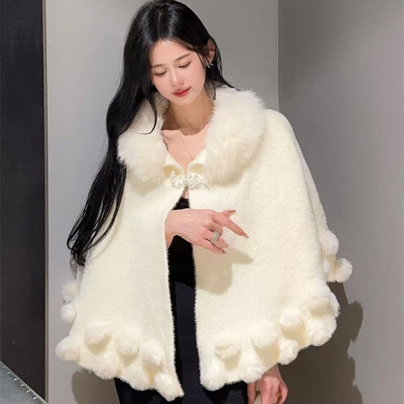 秋冬新款仿皮草披肩斗篷女仿狐狸毛领毛球装饰披风优雅斗篷批发