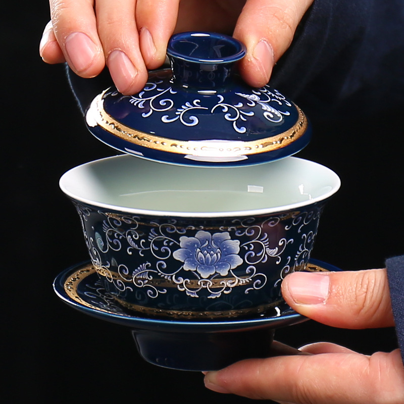 景德镇青花永乐缠芝莲三才盖碗套装泡茶碗陶瓷家用茶碗可悬停礼盒