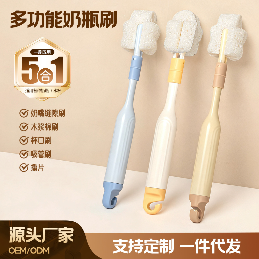 跨境木浆棉五合一可拆卸杯刷多功能奶瓶刷清洗神器婴儿奶瓶刷