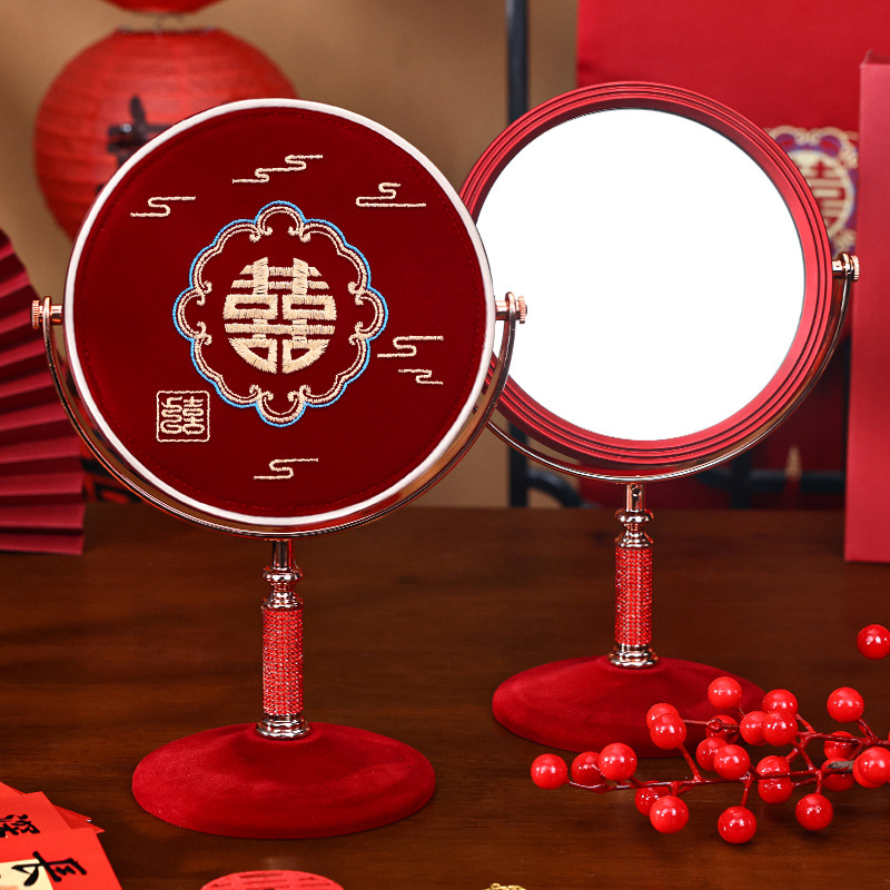 素錦結婚の赤い鏡と花嫁の女性が結婚してお祝いします。