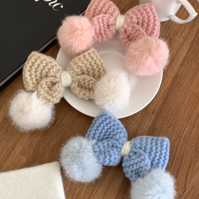 甘くて可愛い毛糸蝶結びのヘアピン秋冬の雰囲気感ウサギの毛球のヘアピンの少女の心のサイドに髪飾りを挟みます。
