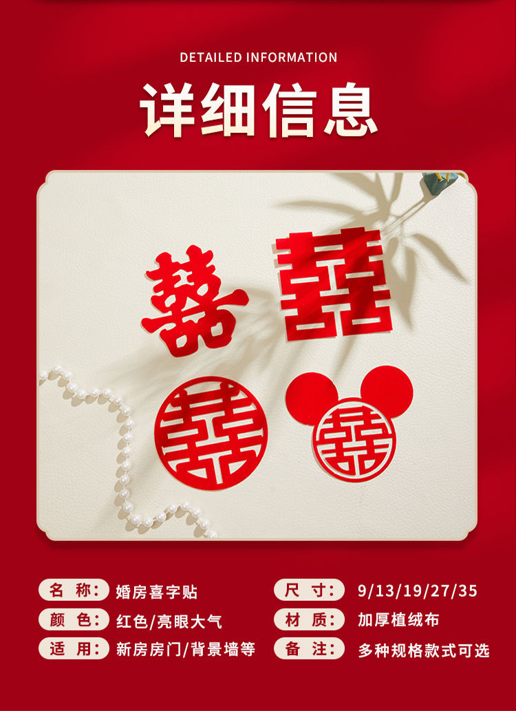喜字は植毛布のタンスの経典の小さい喜字のシールを貼って持っています。
