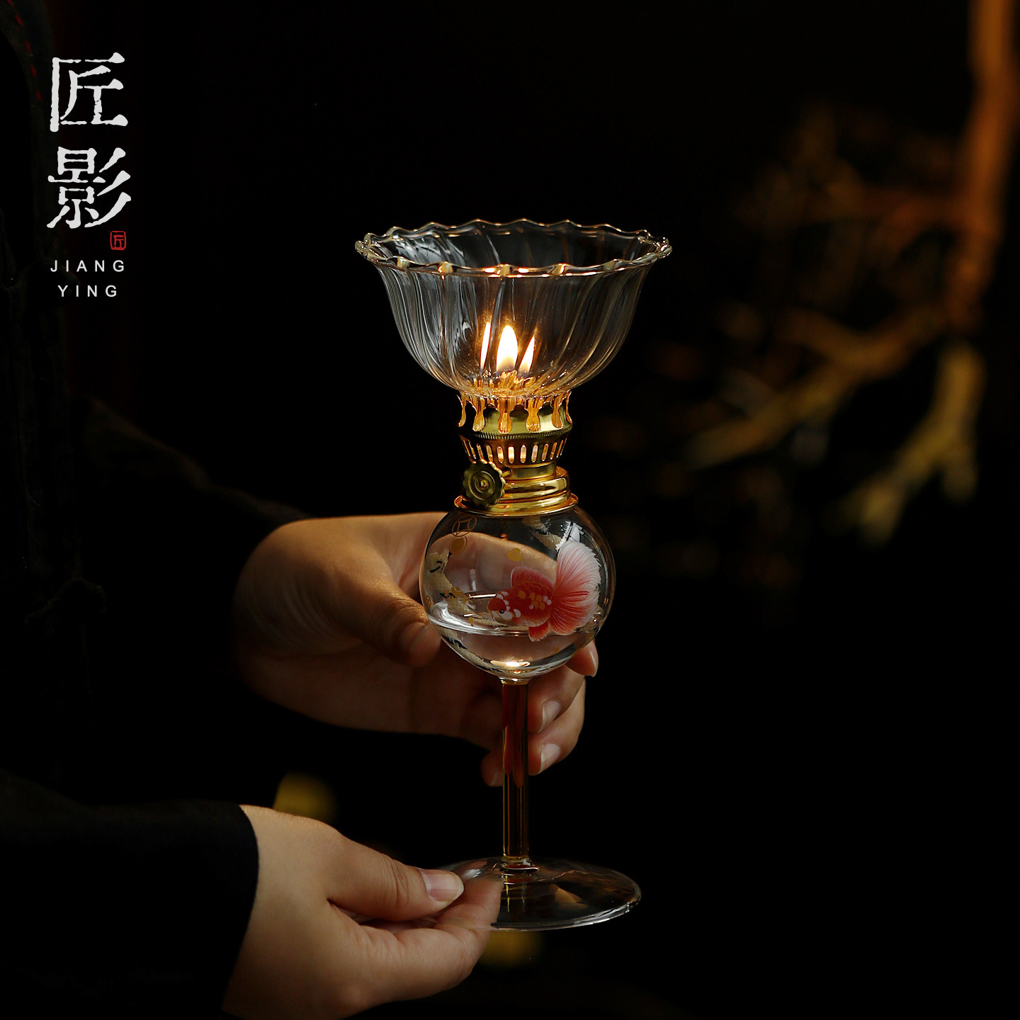匠影新中式禅意酥油灯家用高端玻璃灯茶室装饰品摆件复古氛围灯