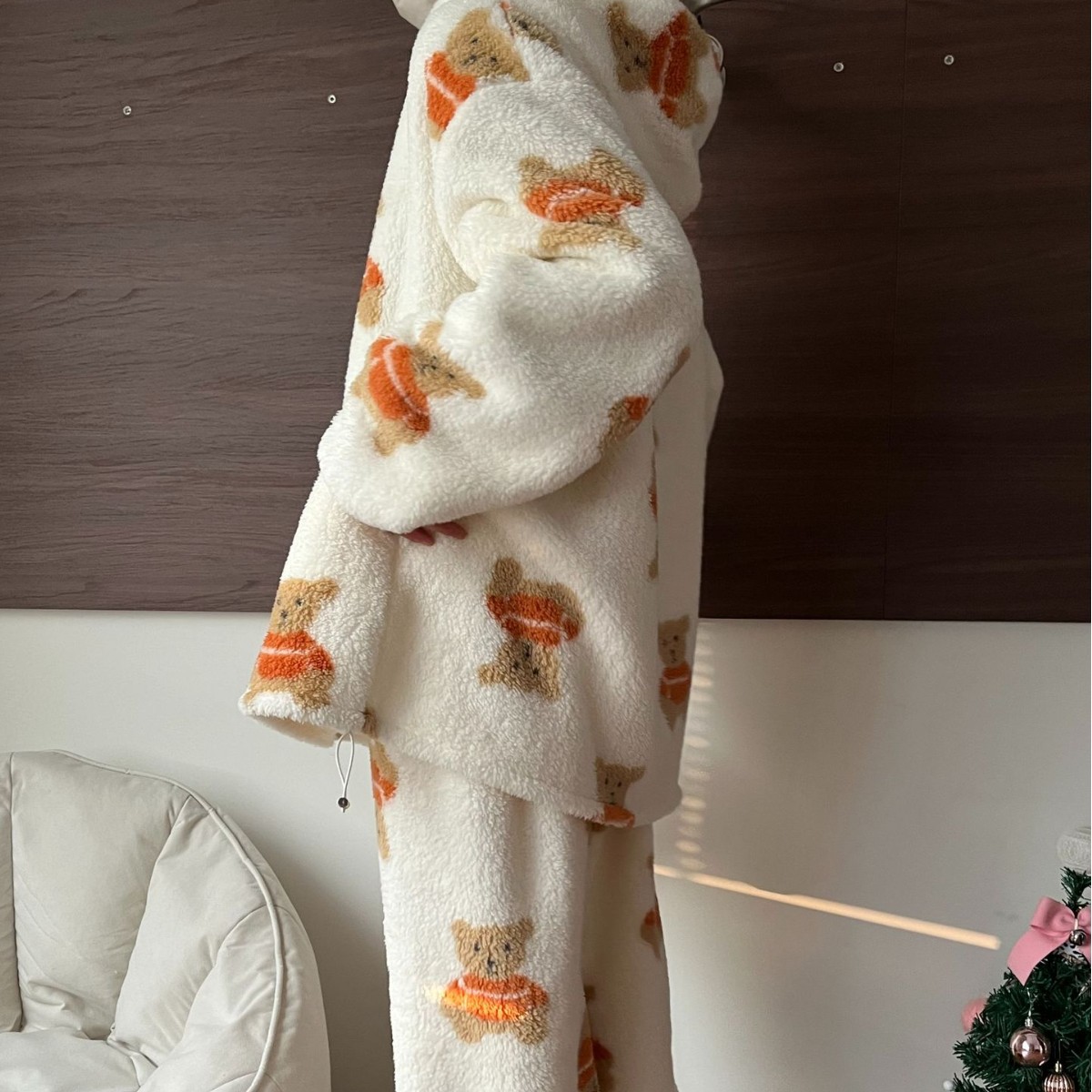 【实拍】小熊连帽抽绳宽松拉链睡衣套装秋冬季毛绒加厚保暖家居服