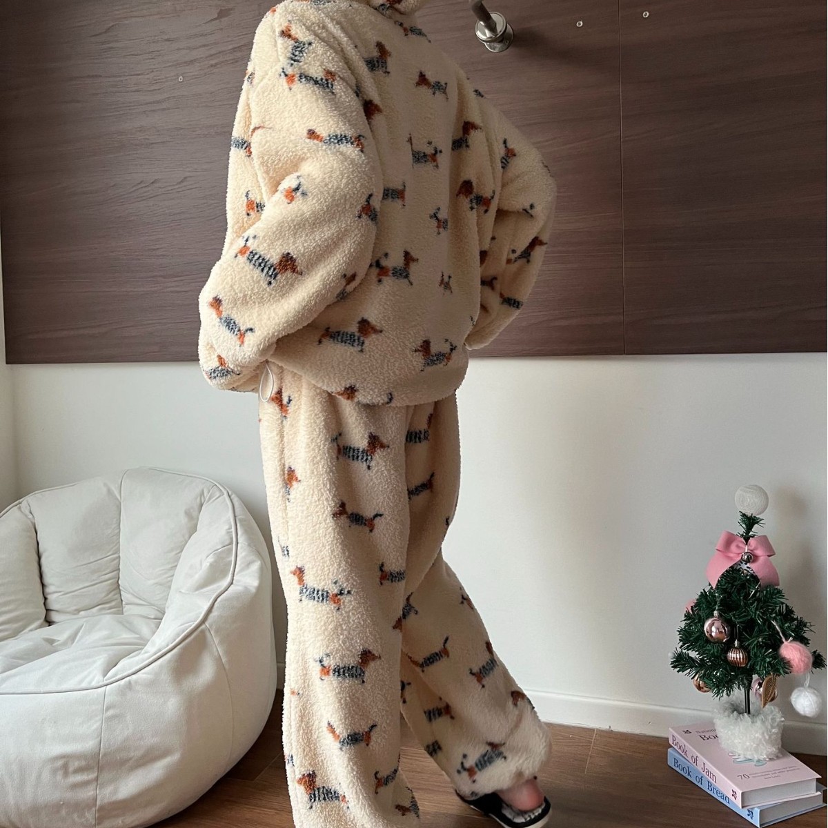 水玉模様のジッパー付きパジャマセット 女性用 秋冬 2024年新作 ダックスフント柄 フリース裏地付き 厚手 暖かい ホームウェア