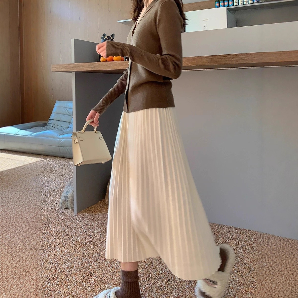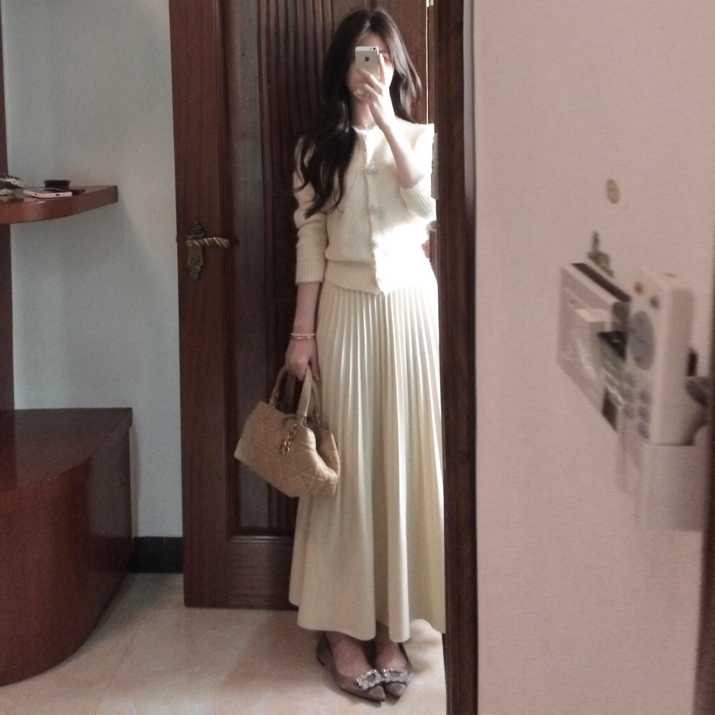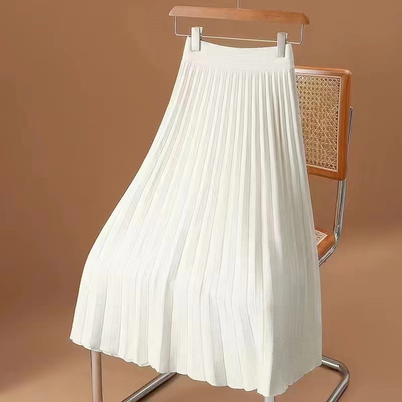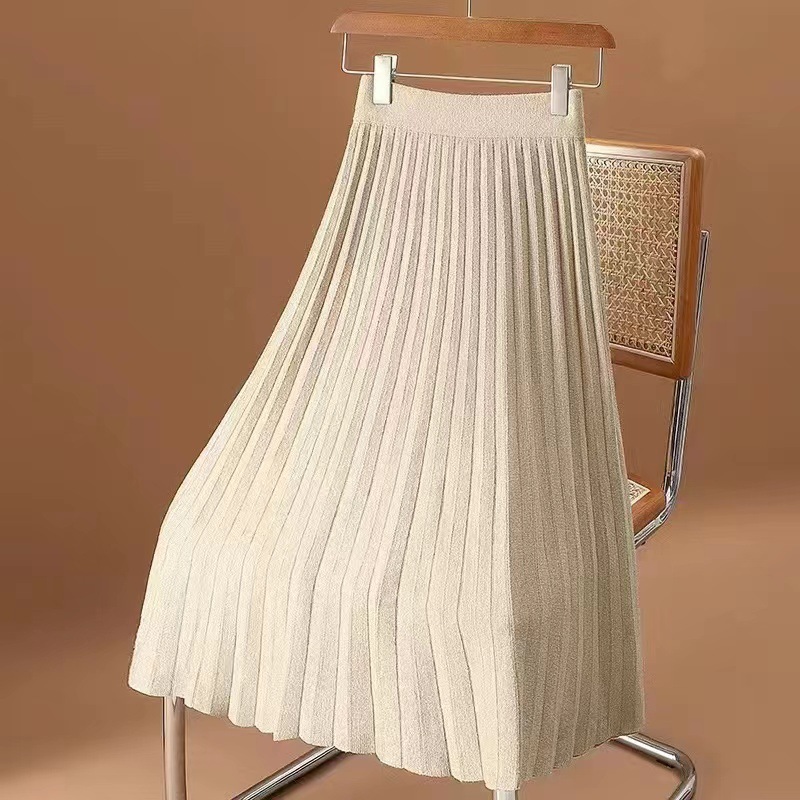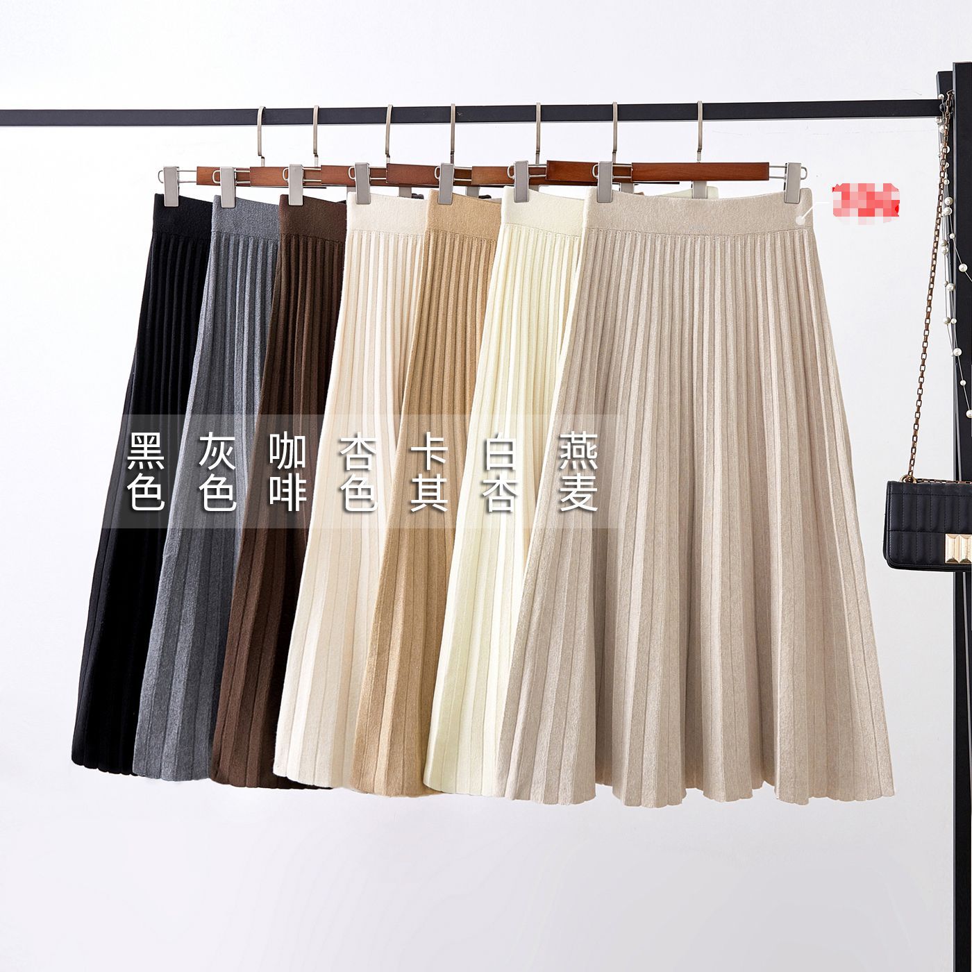 秋冬米白色羊毛针织风琴百褶半身裙女中长款松紧高腰a字裙小个子