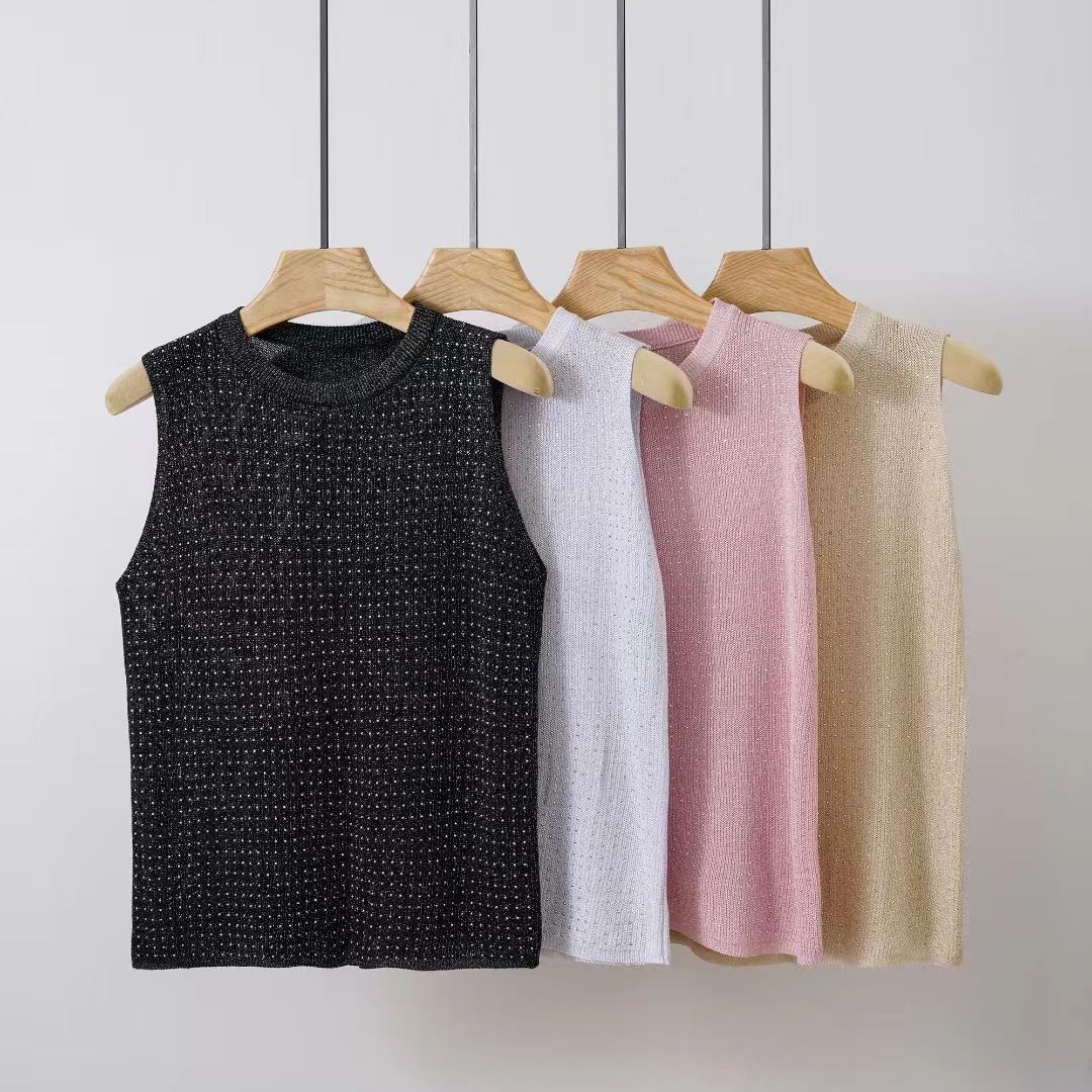 2023熱亮糸袖なしベスト女性春夏新作外着vネックゆるい重工ホットドリルストラップニット上着