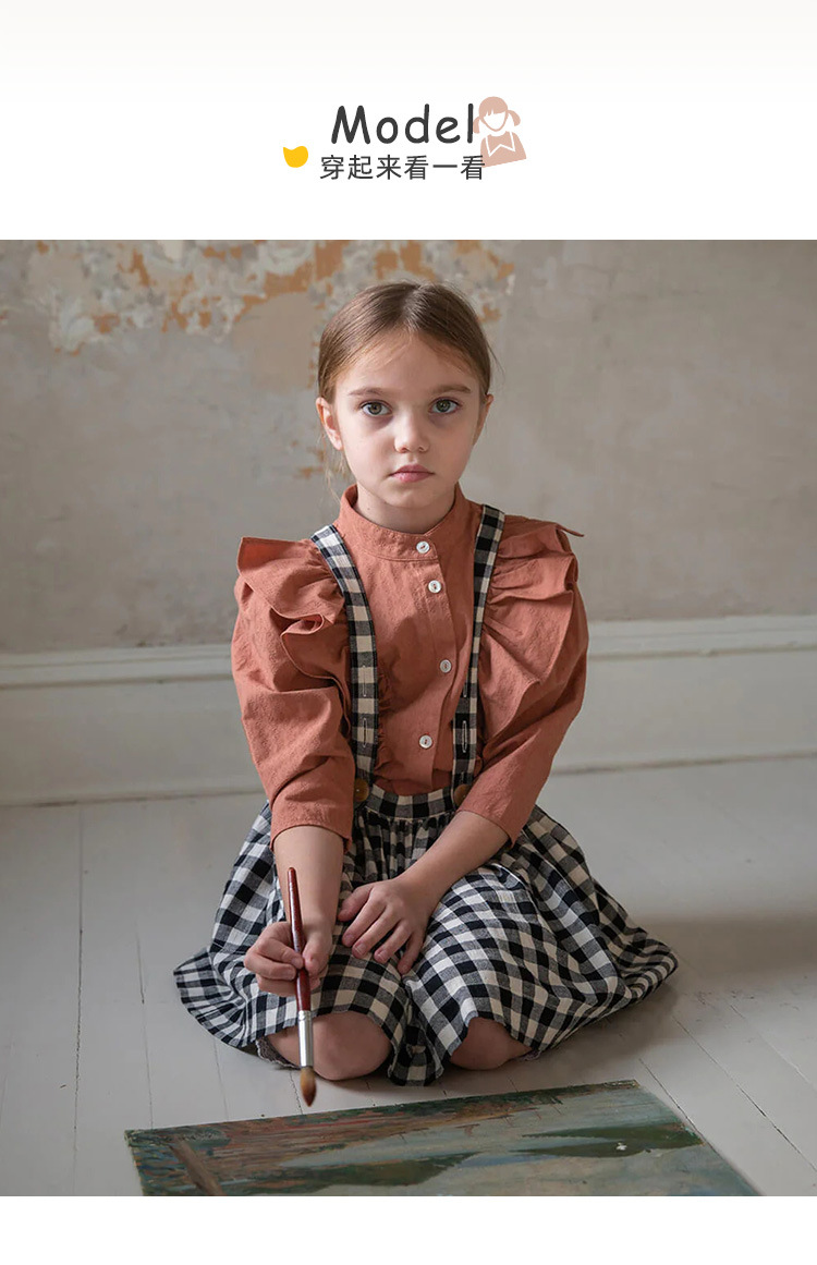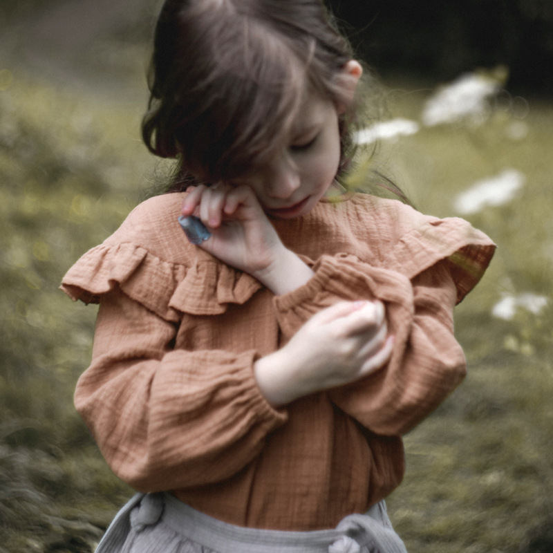 女の子服純綿ガーゼ長袖Tシャツ春秋スタイルフリルネックライン二層しわ生地かわいいフォレストトップ
