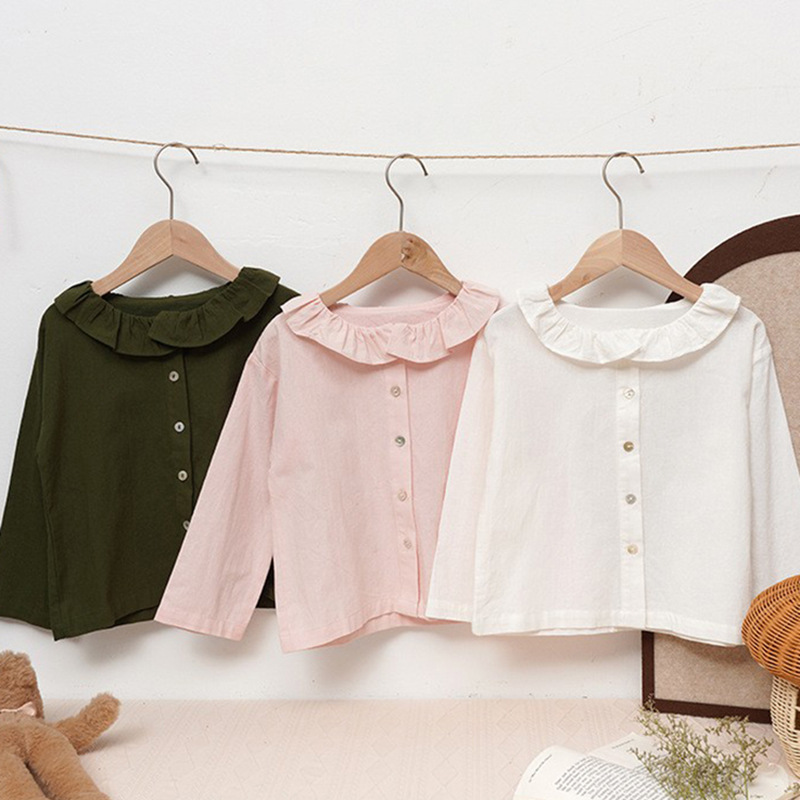春秋宝宝衣服棉麻单排扣纯色衬衣内搭26森系可爱翻领长袖儿童衬衫