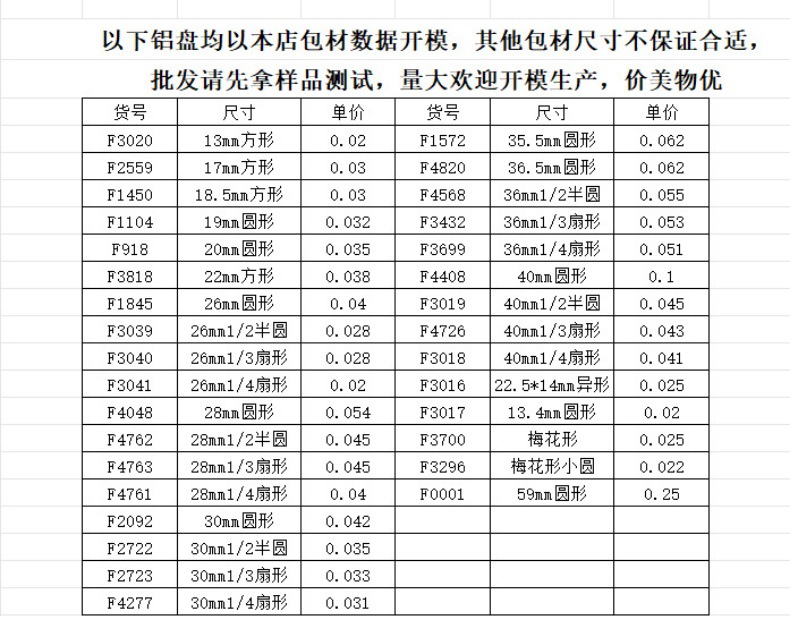 サイズチャート,40mm丸型アルミ板,59mm丸型アルミプレート,30mm丸型アルミ板,20mm丸型アルミ板,26mm丸型アルミプレート,36.5mm丸型アルミプレート,19mm丸型アルミパン,22mm角アルミ板,13mm角アルミ板,17mm角アルミ板,30mm1/2半円形アルミ板,30mm1/3扇形アルミ板,30mm1/4扇形アルミ板,18.5mm角アルミプレート,26mm1/2半円形アルミ板,26mm1/3扇形アルミプレート,26mm1/4扇形アルミディスク,28mm1/2半円アルミプレート,28mm1/3扇形アルミディスク,28mm丸型アルミプレート,36mm1/3扇形アルミディスク,36mm1/4扇形アルミディスク,40mm1/3扇形アルミ板,40mm1/4扇形アルミディスク,28mm1/4扇形アルミプレート,13.4mm丸型アルミディスク,36mm1/2半円形アルミプレート,35.5mm丸型アルミディスク,40mm1/2半円形アルミ板,梅の花型アルミ板,22.5*14 特殊形状アルミ板,梅の花型アルミ板中丸
