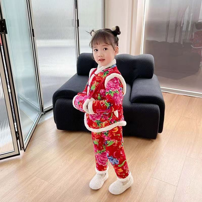 DJT女童东北大花棉袄冬女宝宝加绒加棉套装中国风加厚拜年服冬装