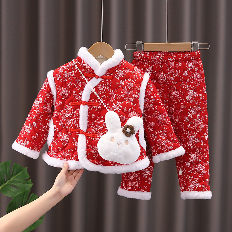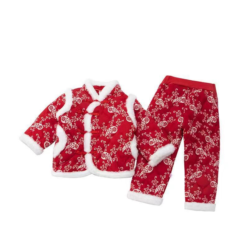子供用綿服セット 中国風 中綿入り 厚手 ネット人気 大きな花柄 綿衣 綿ズボン 暖かい ベビー 厚手 正月服