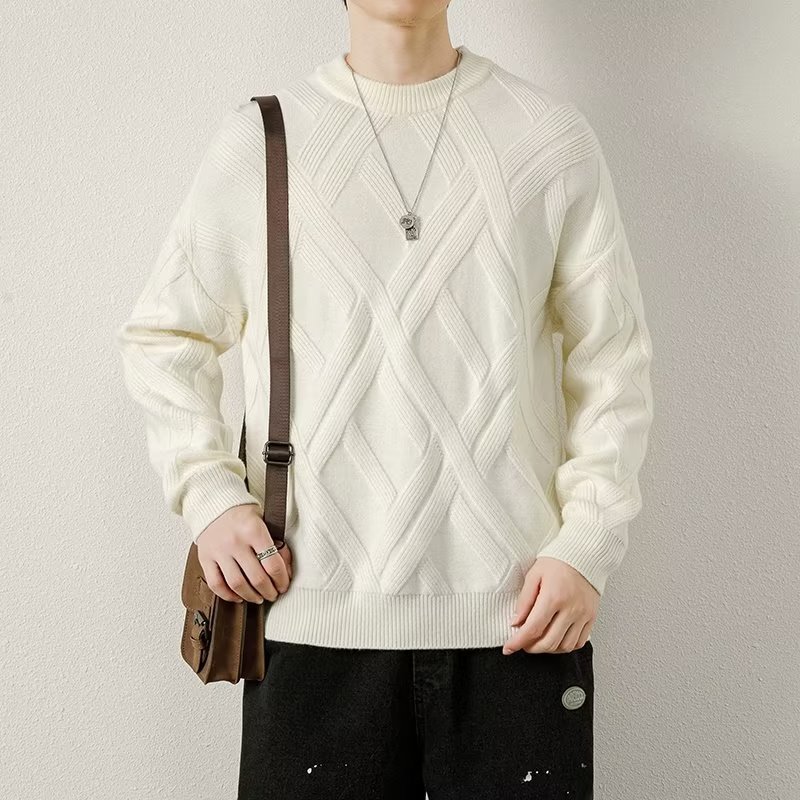 新しい厚手の長袖菱形ニットセーター、メンズレトロ香港風ベースレイヤーセーター、秋の高級感のあるラウンドネックセーター