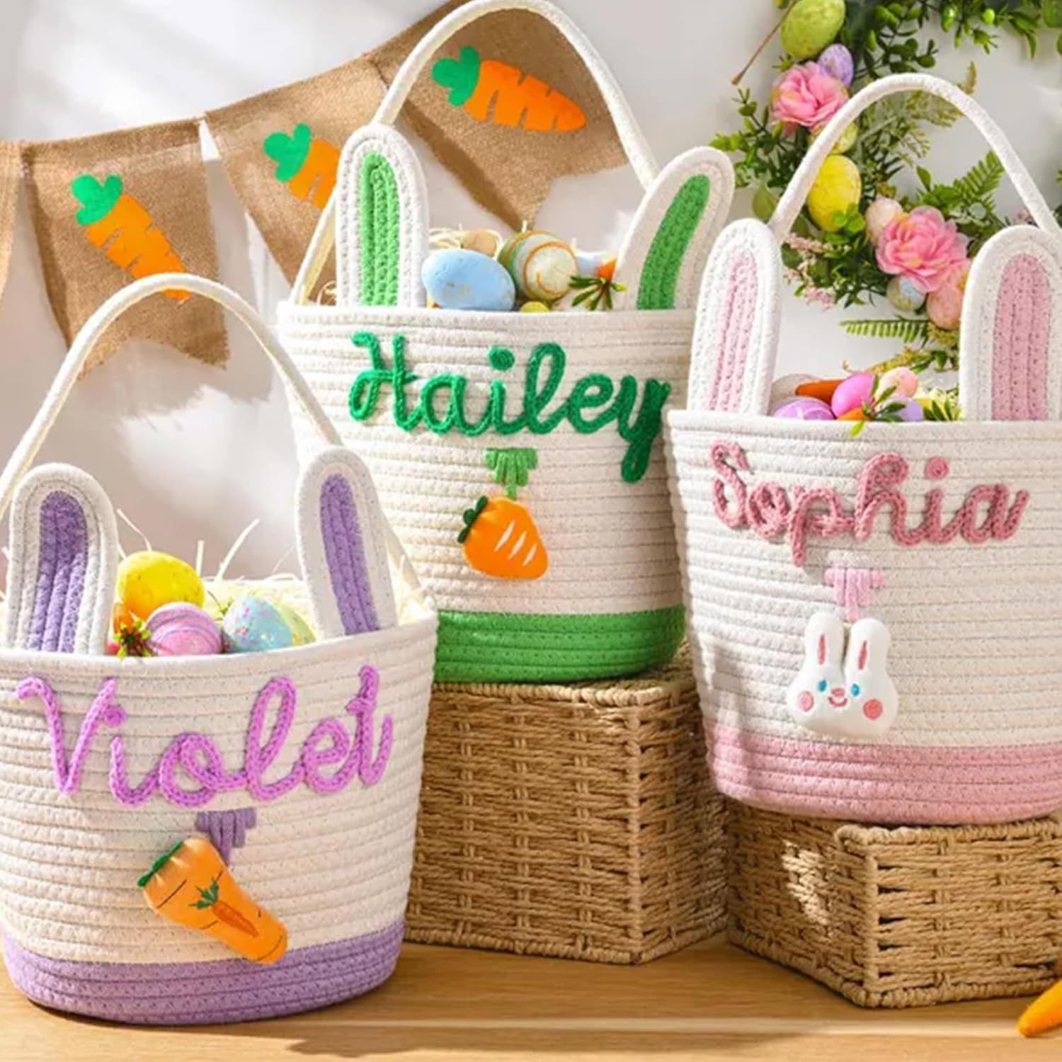 etsy可编名字个性化复活节棉绳编织收纳筐棉线绳兔子手提篮复活节