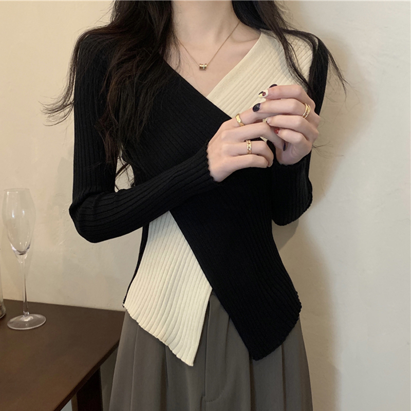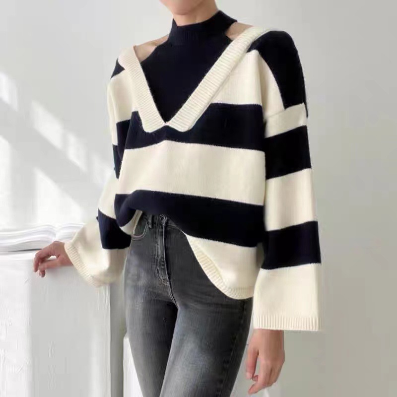 秋冬の新型の婦人服の偽の2つの注意機は首を掛けて肩のセーターのストライプの洋風のメリヤスの底のシャツを現してゆったりしています。