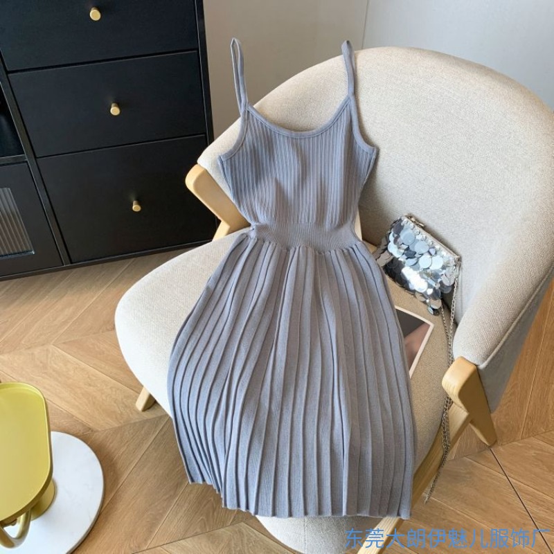法式赫本风气质针织连衣裙百褶新款气质纯欲风显瘦收腰吊带长裙