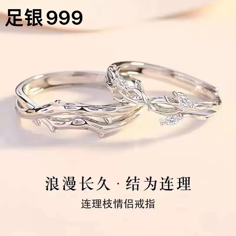 999纯银戒指连理枝情侣对戒一对男女款小众设计开口可刻字情人节