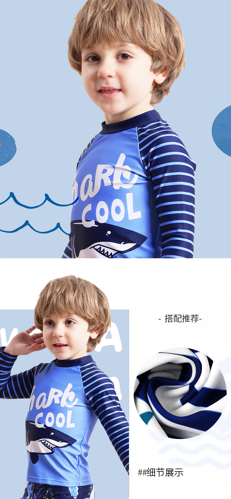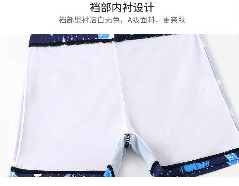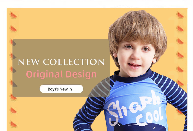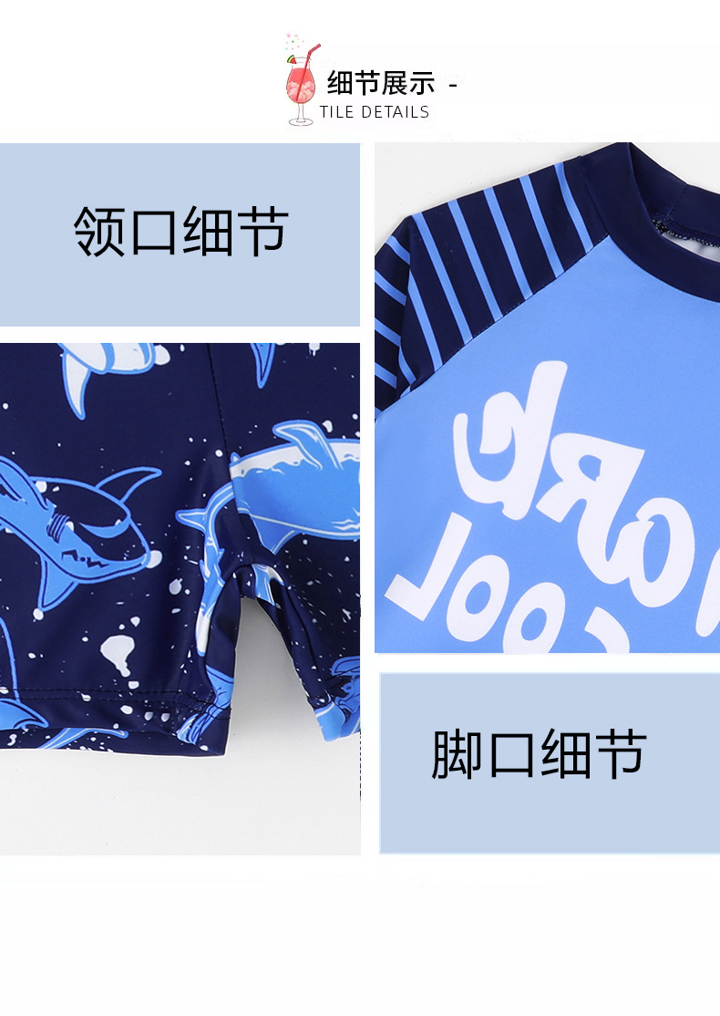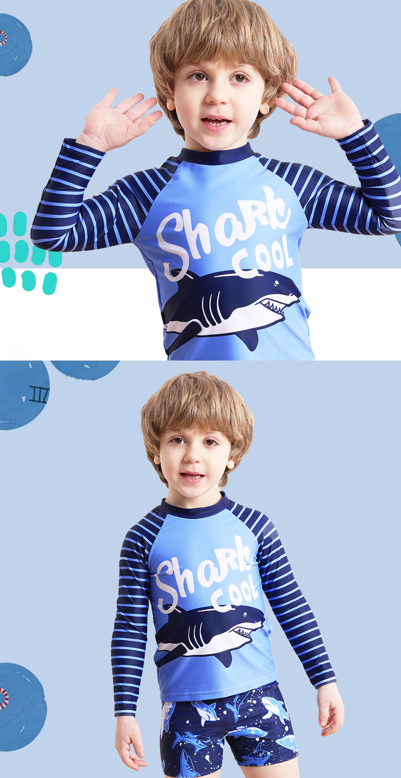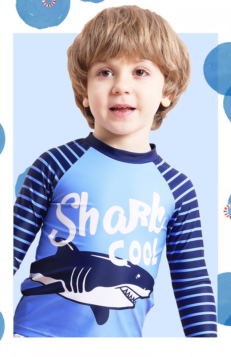 新型男児分体水着長袖日焼け止めサメ模様児童児童水着快適高弾送水泳帽