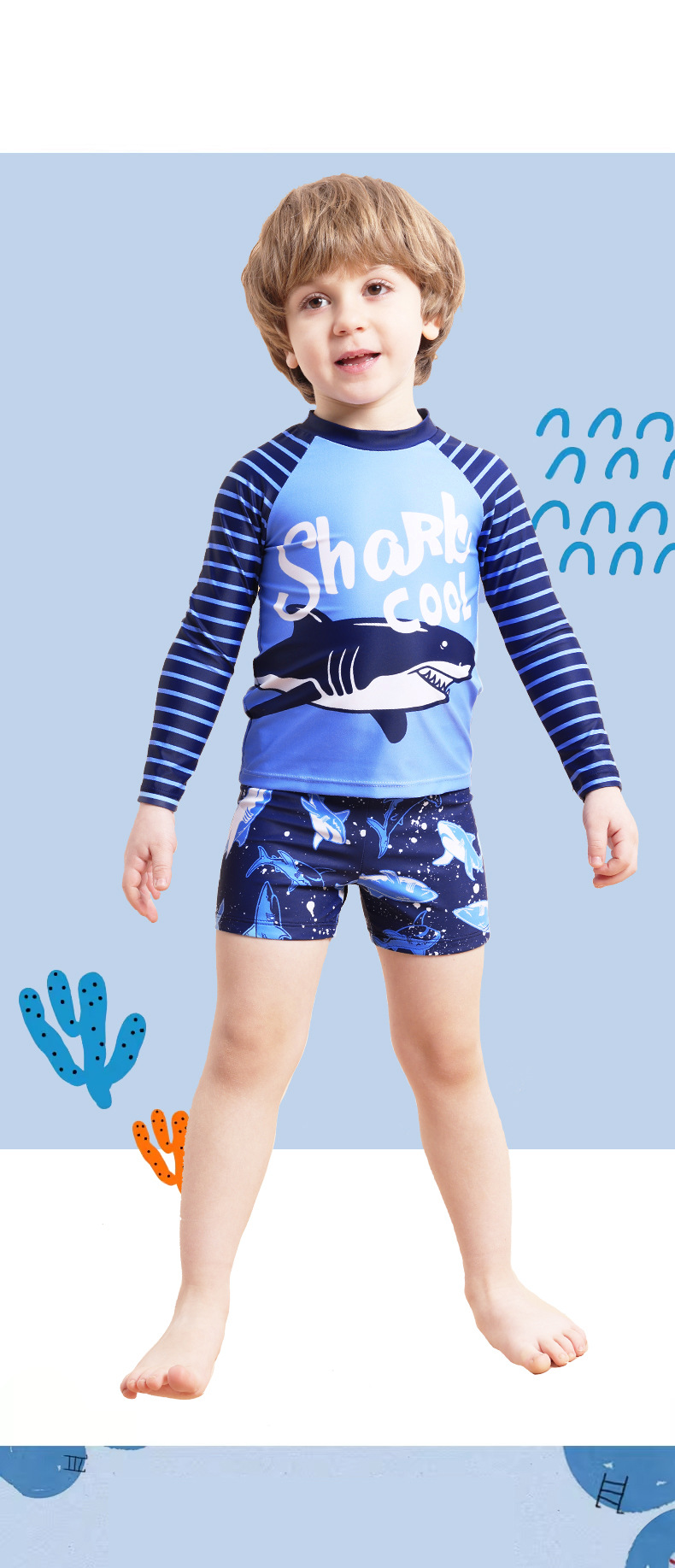 子供用水着 男の子 長袖水着 2025年新作 サメ柄ストライプ ツーピース水着 男の子用水着