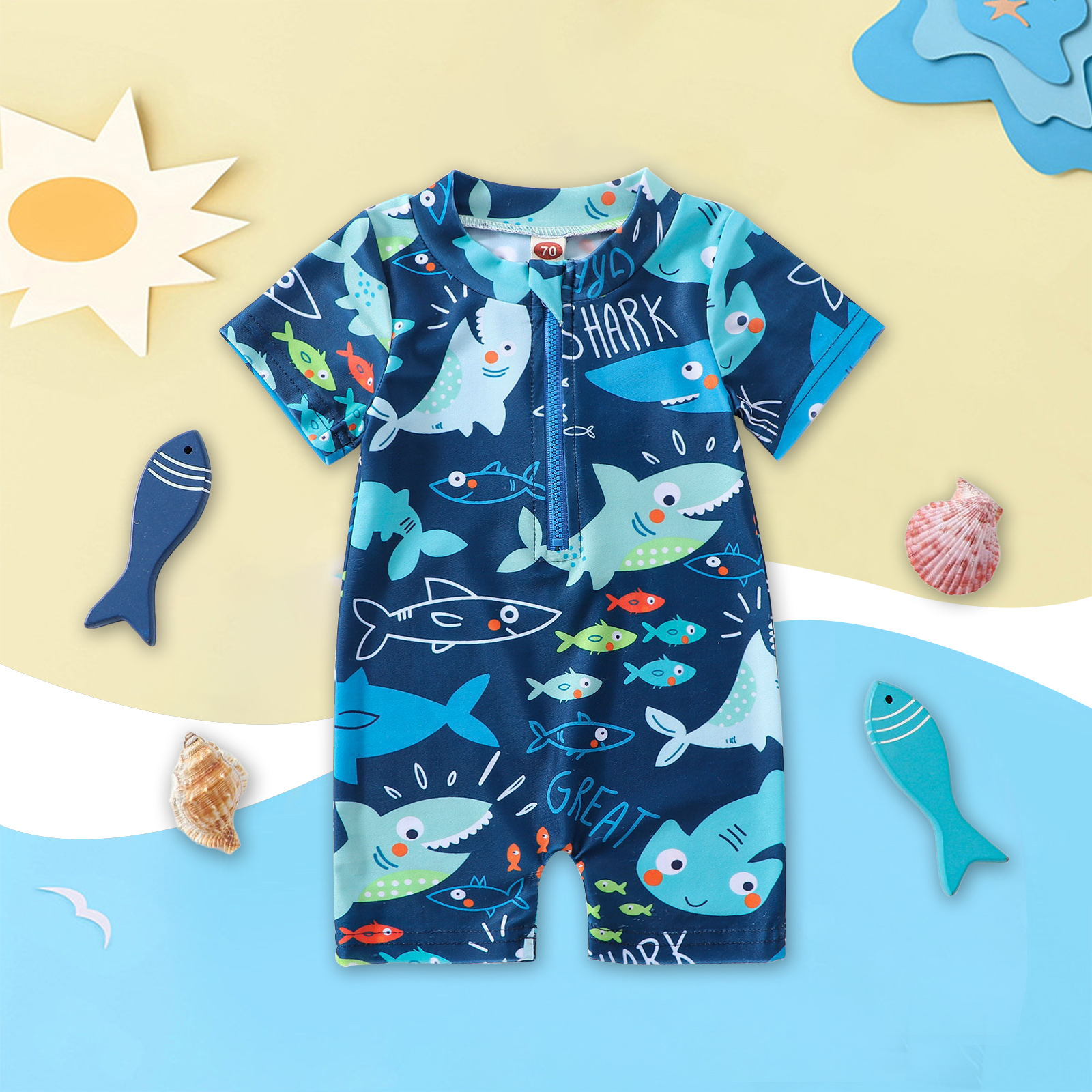 夏の新作男女兼用ベビー欧米風サメ柄水着ジッパー付き半袖幼児用海辺遊び速乾