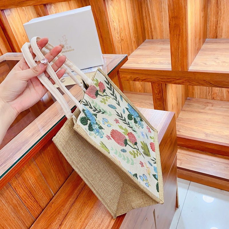 亜麻のハンドバッグの質感は厚い麻の袋の2024の新しい経典の花型の外出するショッピングバッグのファッションのカバンの女性のカバンを包みます。
