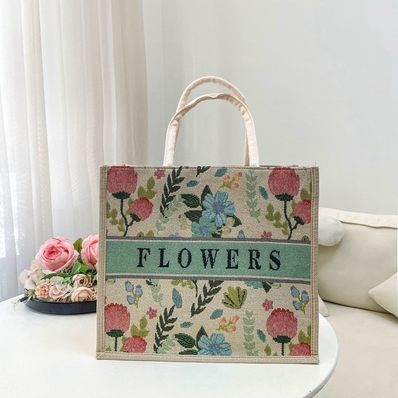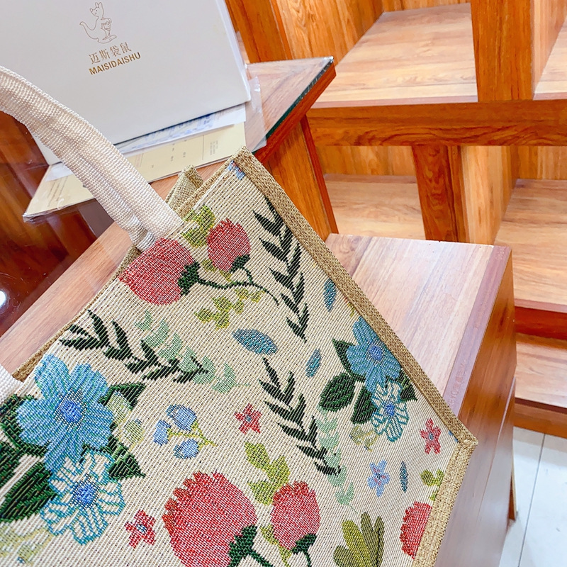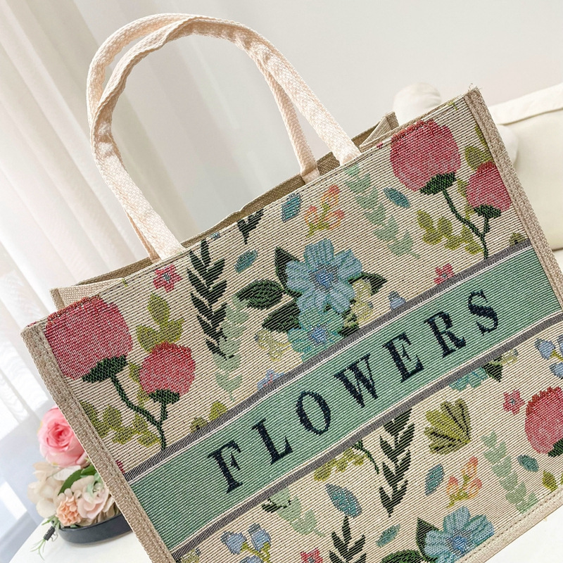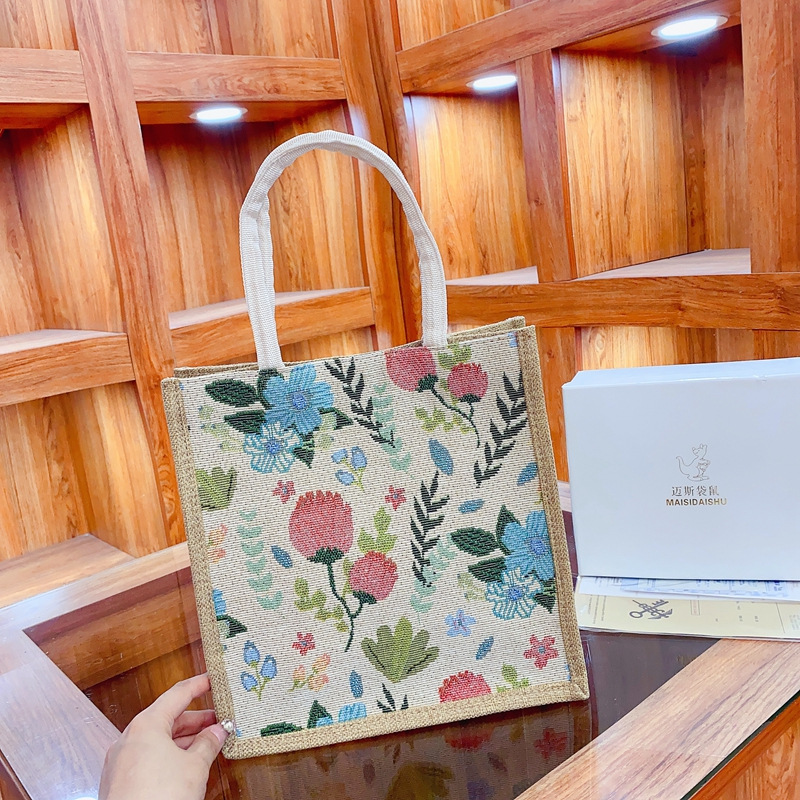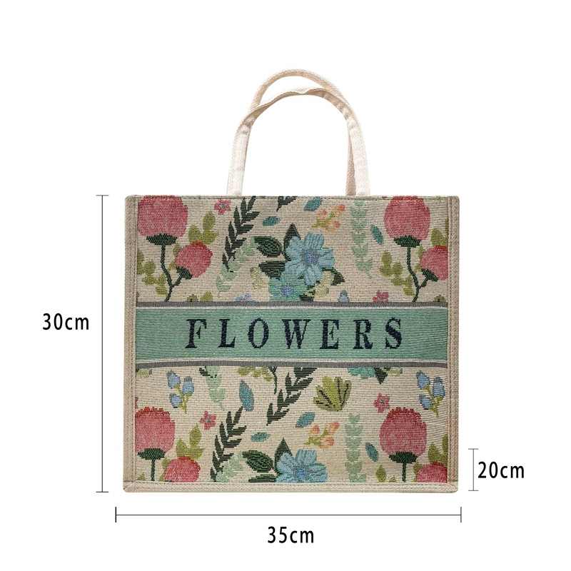 クロスボーダーリネンハンドバッグ、おしゃれで大容量の綿麻バッグ、新作花柄通勤大学生向け万能ハンドバッグ