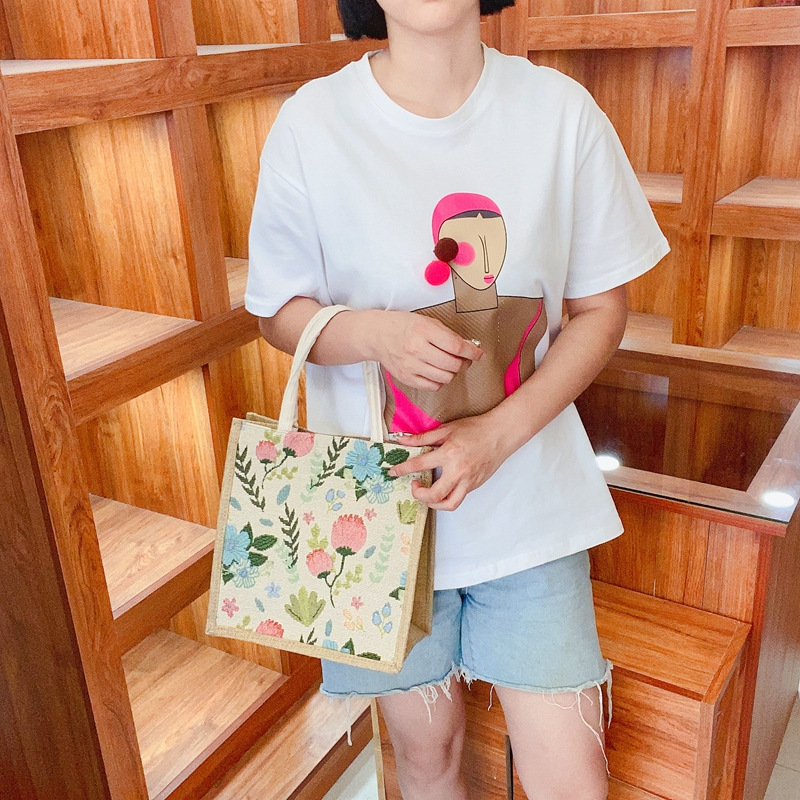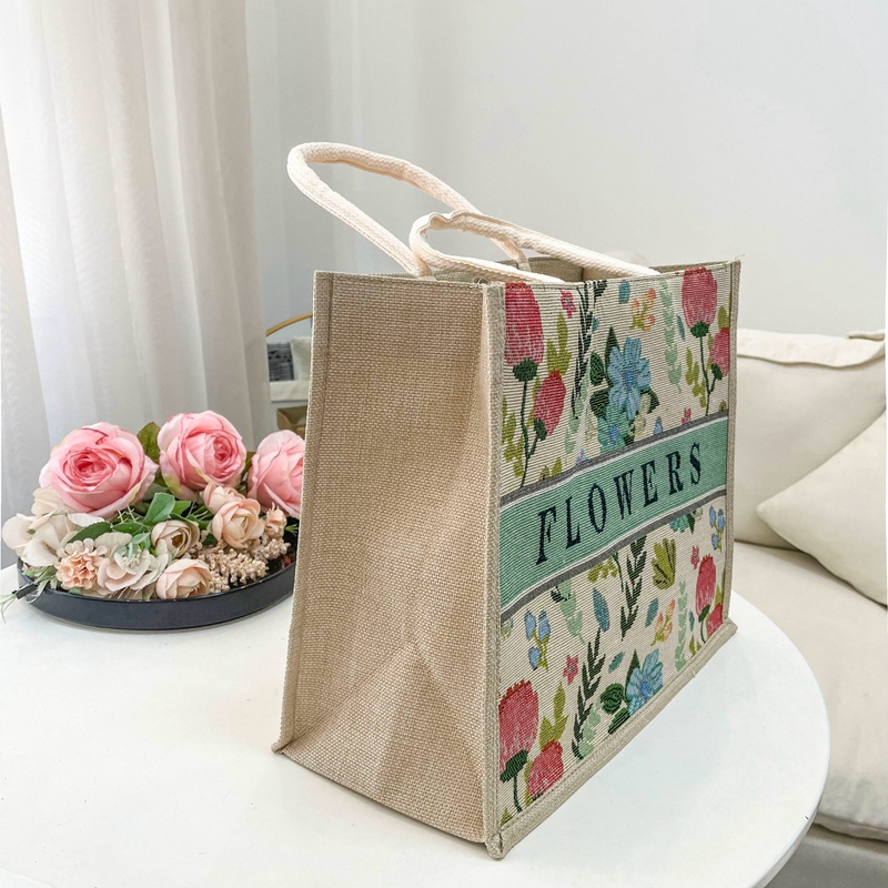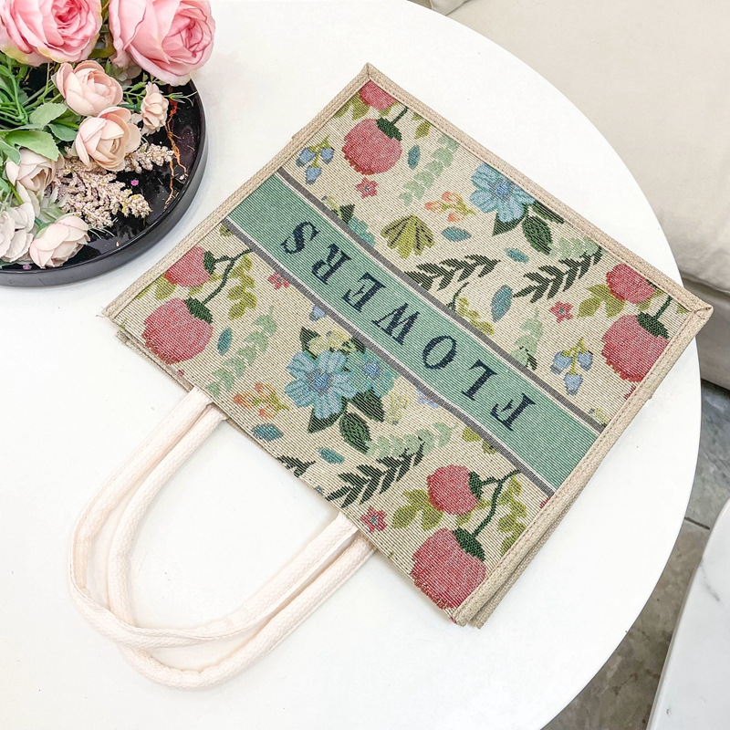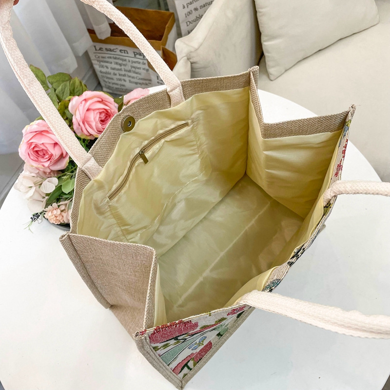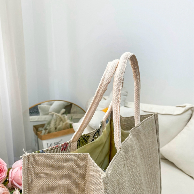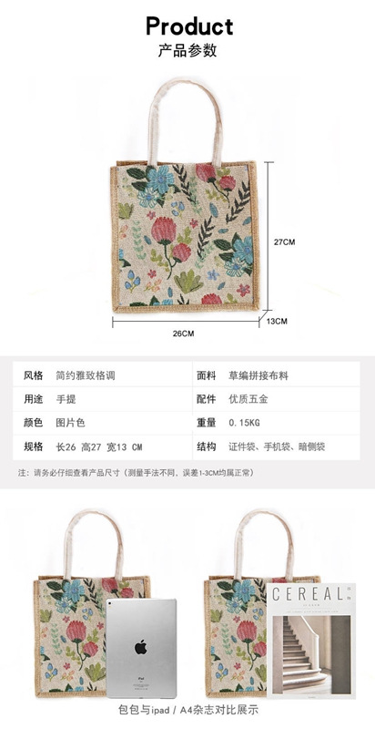 クロスボーダーリネンハンドバッグ、おしゃれで大容量の綿麻バッグ、新作花柄通勤大学生向け万能ハンドバッグ